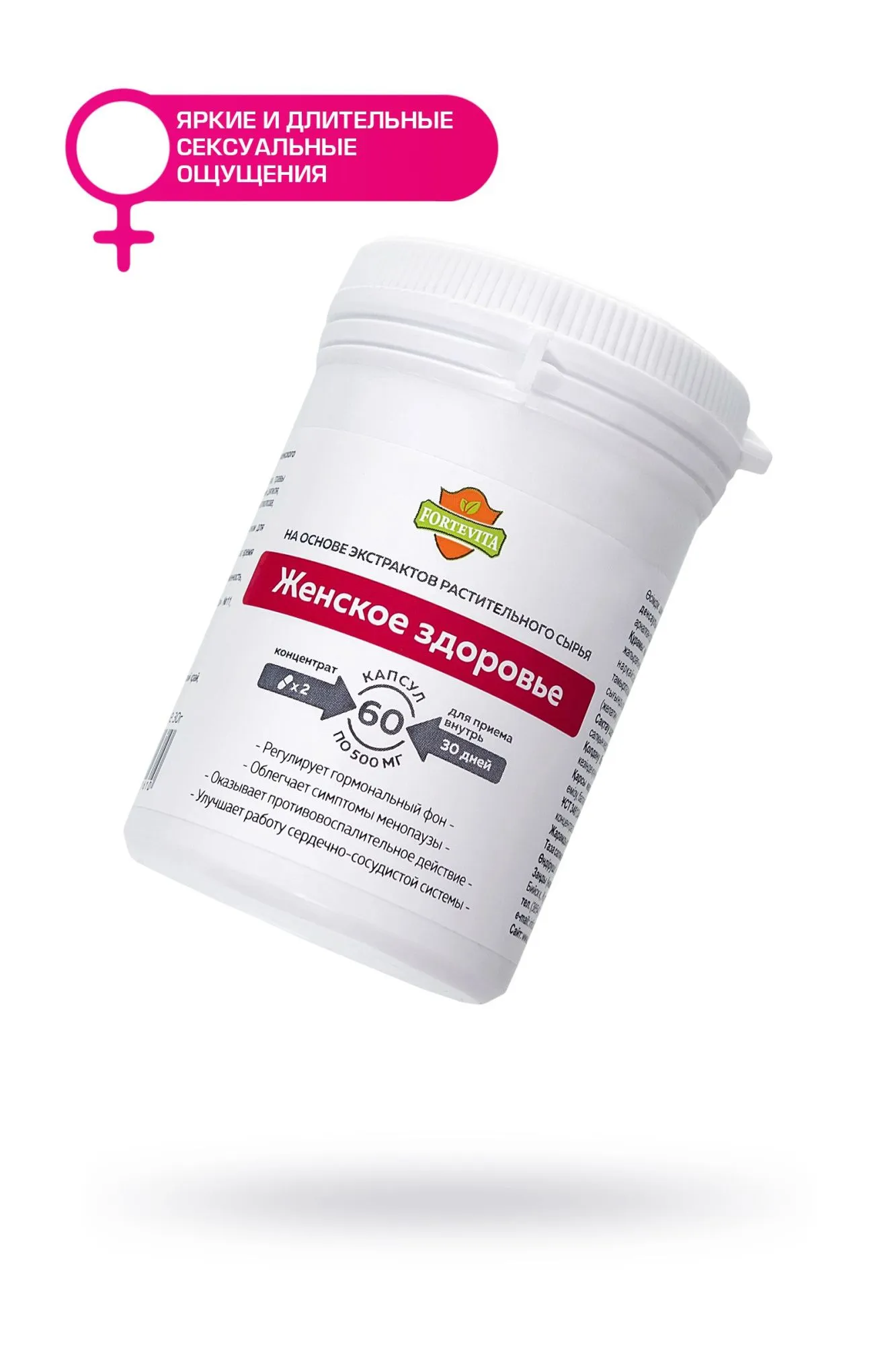 «ForteVita» «ЖЕНСКОЕ ЗДОРОВЬЕ» 60 капсул по 500 мг Все самое лучшее, что может дать природа для женского здоровья, собрано в биологически-активной добавке ForteVita "Женское здоровье". Поддерживать молодость, красоту и активный образ жизни помогает концентрат Женское здоровье. Принимая по 1 капсуле 2 раза в день во время еды в течение 30 дней, вы почувствуете прилив энергии, улучшение умственной и физической активности. Сочетание целебных трав и растений-афродизиаков положительно действует на либидо и гормональный фон, что особенно важно в период менопаузы. Сочетание экстрактов корней красной щётки, листа боровой матки, травы душицы, листа дамианы, травы вербены, травы горянки, корней дягиля, травы пустырника, корней заманихи не только активирует иммунную систему организма в целом, но и обладает противовоспалительным действием улучшает эндокринную функцию и нормализует гормональный баланс ускоряет обмен веществ и бережет нервную систему стимулирует половое влечение и качество секса помогает сконцентрироваться и повысить работоспособность влияет на антиоксидантную защиту организма дает яркие и длительные сексуальные ощущения в вашей интимной жизни. Проявите свою природную сексуальность и чувственность по-новому. Быть страстной, желанной и порхающей – все это дает Женское здоровье ForteVita. Активная и уверенная женщина, защищенная от стресса и усталости – откройте и выпустите свою внутреннюю Богиню. Противопоказания: индивидуальная непереносимость, беременность, кормление грудью. Количество в упаковке: 60 капсул Срок годности: 24 месяца