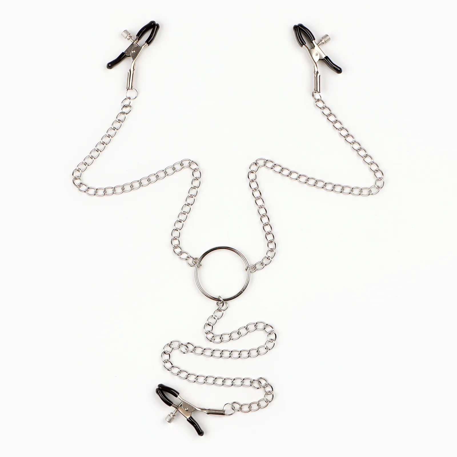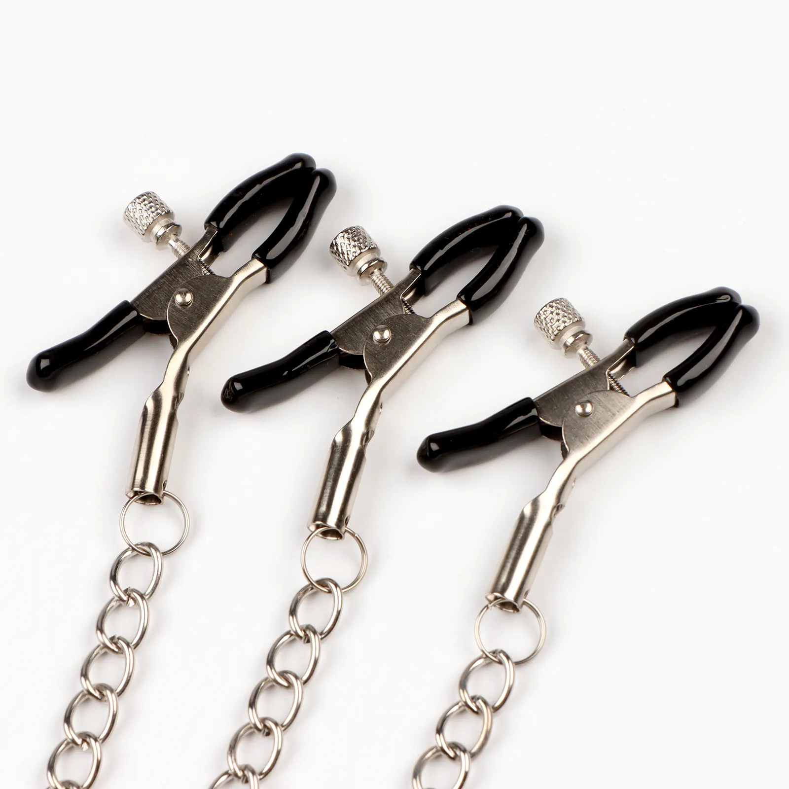 Зажимы для сосков и клитора изготовлены из алюминия, изделие имеет пластиковые наконечники. Длинная цепь позволяет одновременно использовать зажимы для сосков и клитора. Соединяющая цепочка является не только красивым дополнением, но и позволяет оттягивать и вращать соски для получения дополнительных приятных ощущений. Можно использовать как самостоятельный стимулятор, а также как дополнение к прелюдии и сексу.