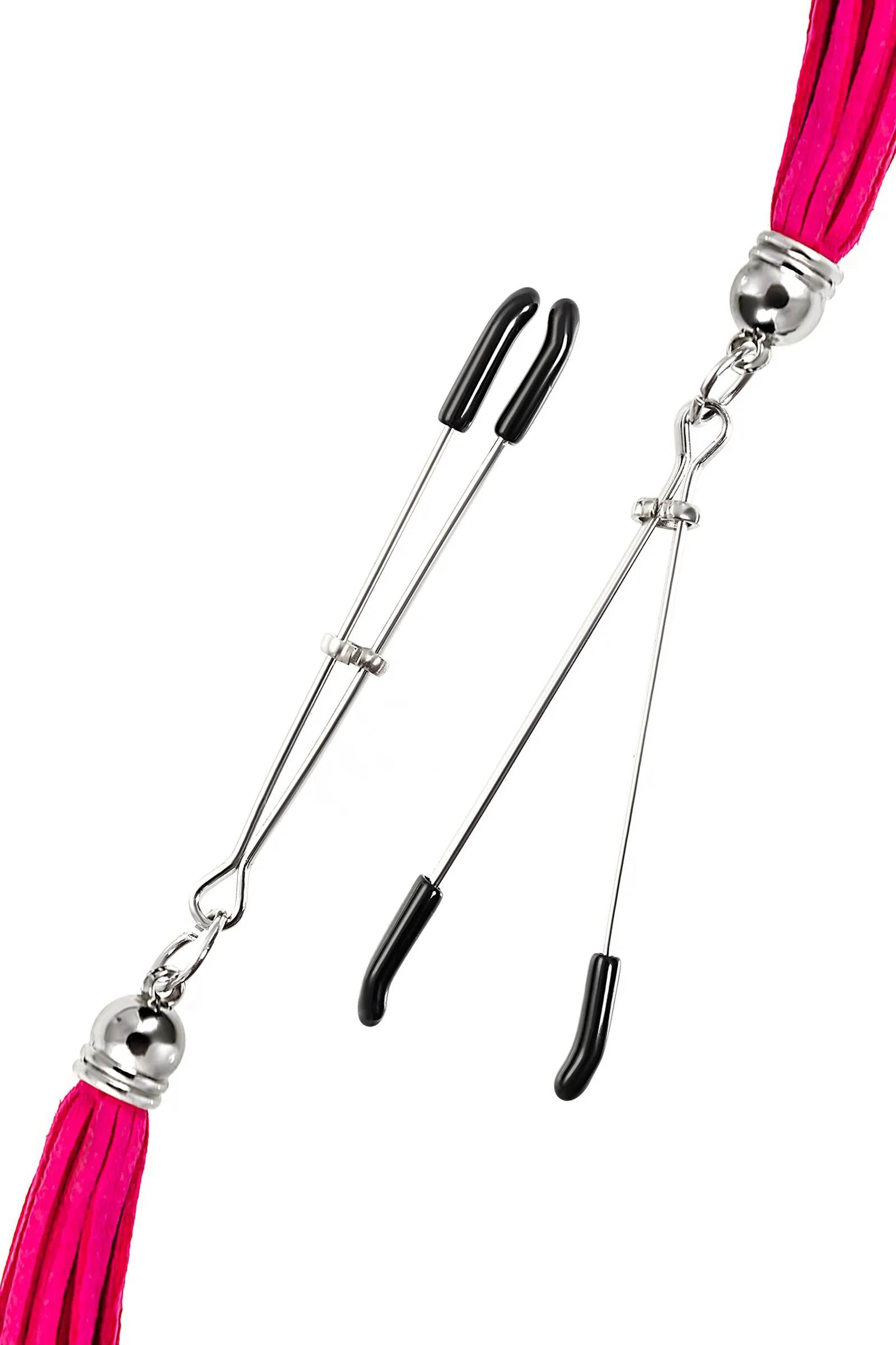 Попробуйте новые, дерзкие ощущения глубокого наслаждения! Зажимы-вилки от Pecado гарантируют смешение ярких чувств от тактильного контакта с нежной кожей сосков. Зажимы выполнены из высококачественных материалов. Металлическая часть компактная, приятная на ощупь. На концах черные резиновые наконечники, для безопасного воздействия на эрогенные зоны. Интенсивность сжатия аксессуара регулируется миниатюрными колечками. В зависимости от личных предпочтений и сценария игры, можно выбрать легкое пощипывание, или сильное сдавливание. Бахрома из натуральной замши, в насыщенном цвете фуксии, добавляет манящую красоту смелому атрибуту. При каждом соблазнительном покачивании груди, кисточки движутся в пикантном ритме. Также подходит для стимуляции и возбуждении в области половых губ и клитора. ● Ручная работа. ● Надежная высококачественная фурнитура. ● 100% натуральная замша. ● Не требуют специального ухода.