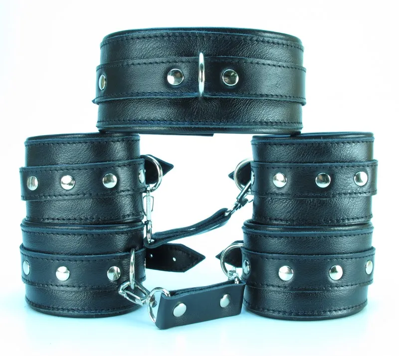 Набор аксессуаров, изготовленных из натуральной кожи. В него входят: наручники и поножи, украшенные заклепками (ширина — 5,7 см), которые можно соединять и комбинировать между собой при помощи прочных перемычек (длина 6 см) с карабинами (входят в комплект). Размер меняется при помощи застежки. Так же имеется ошейник, шириной 5,7 см, с одним кольцом. Размер регулируется застежками. Модный интимный аксессуар не сдавливает и не нарушает кровообращение, так как изготовлен из мягкой кожи. Упаковка: картонная подложка.