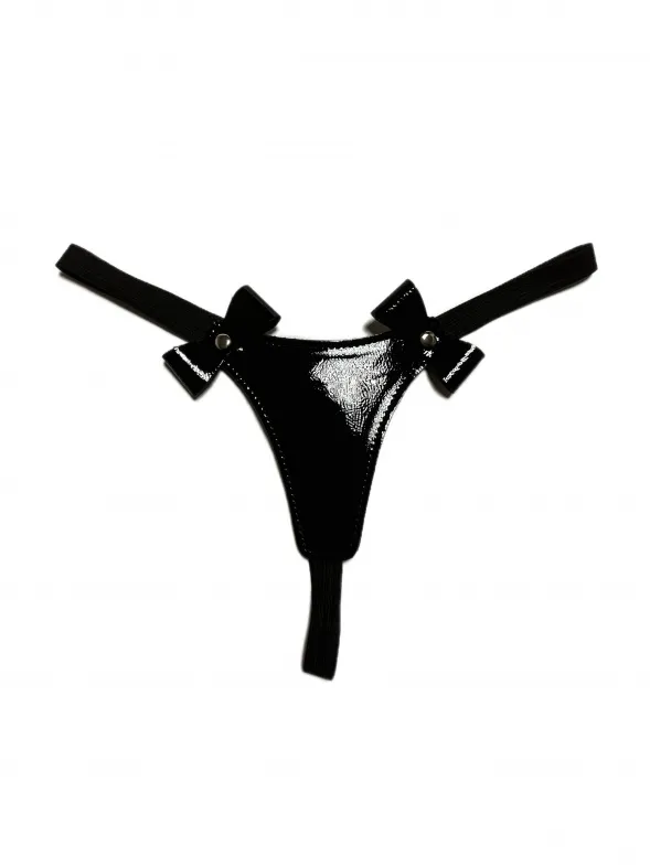 Сексуальные черные стринги, выполненные из эко-кожи. Декорированы спереди двумя бантиками. Лицевая сторона выполнена из лакового материала, а внутренняя из матового. Благодаря эластичной резинке, отлично сядут по фигуре, подойдут на размеры 40-46. Очень красивая и удобная модель, которая поможет создать дерзкий сексуальный образ для вашей любовной игры! Материал: эко-кожа, эластичная резинка, металл Цвет: черный