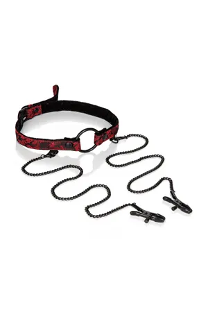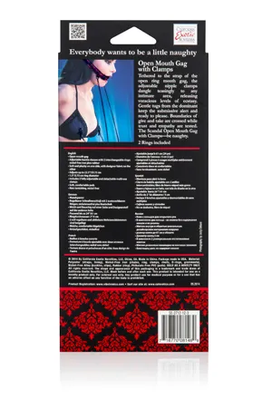 Scandal Open Mouth Gag with Clamps – приспособление для фиксации рта в открытом состоянии, в форме буквы «О» с зажимами на соски. В комплект входит два сменных кольца, одно металлическое и одно резиновое. Ремешок ручной работы с двойной мягкой подкладкой, двойной прошивкой и регулируемой пряжкой.