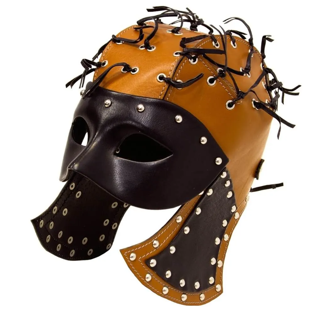 Шлем выполнен из натуральной кожи черного и рыжего цветов и украшен металлическими клепками и тонкими полосками кожи.