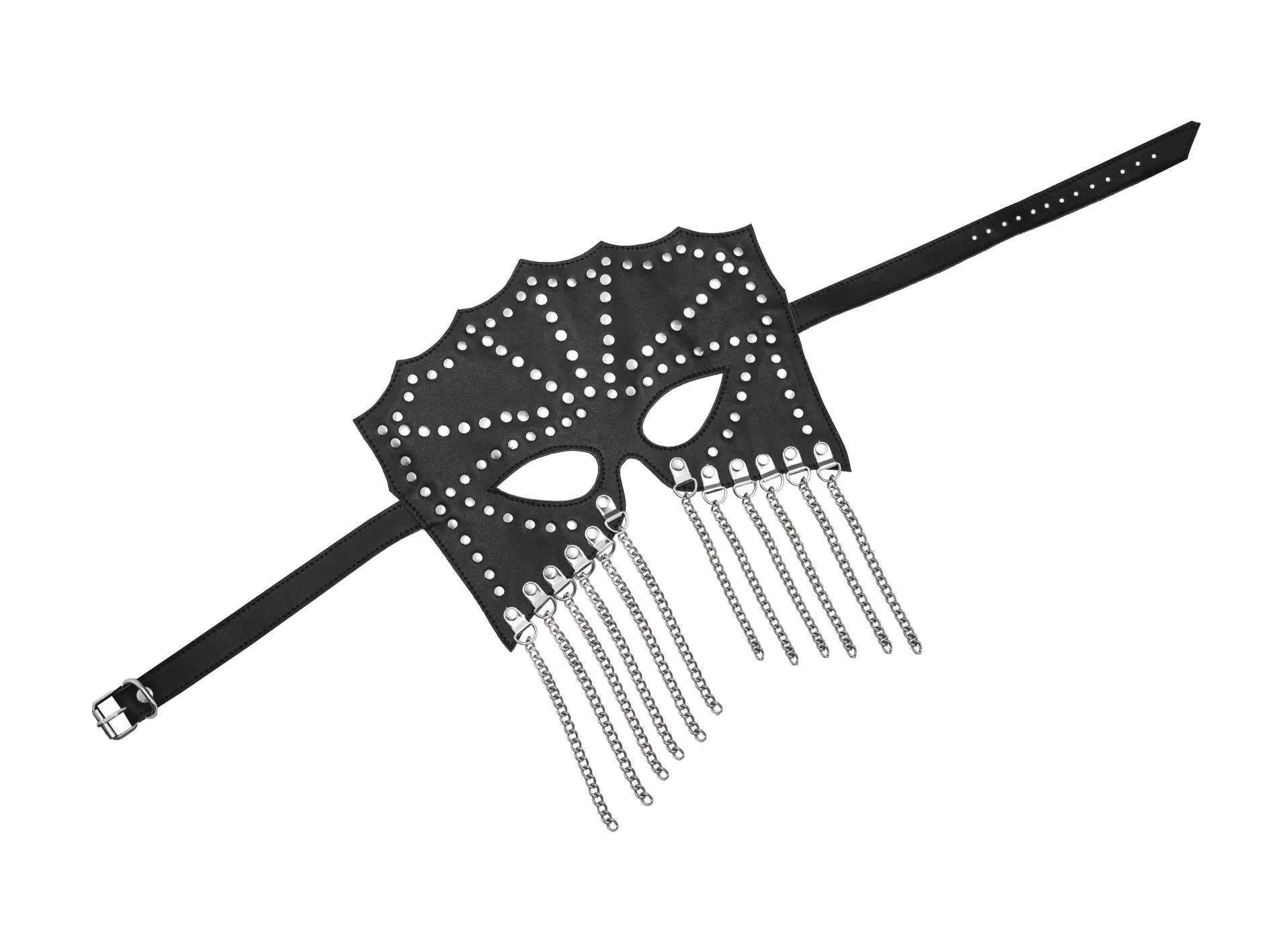 Маска изготовлена из натуральной кожи, украшена цепочками и металлическими заклепками. Маска плотно застегиваются с помощью ремешка с регулируемой пряжкой. Данное изделие станет прекрасным дополнением вашего образа в стиле БДСМ.