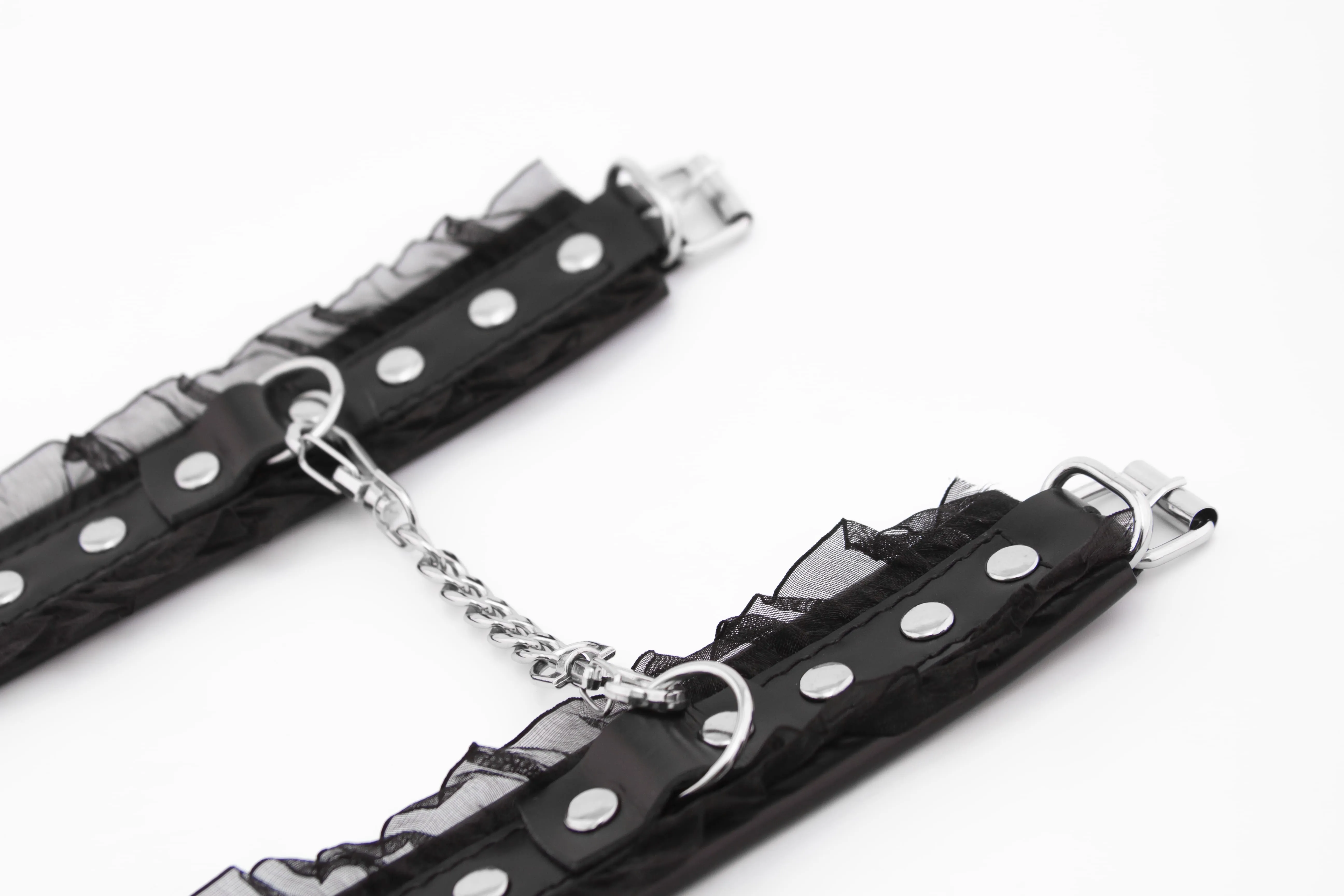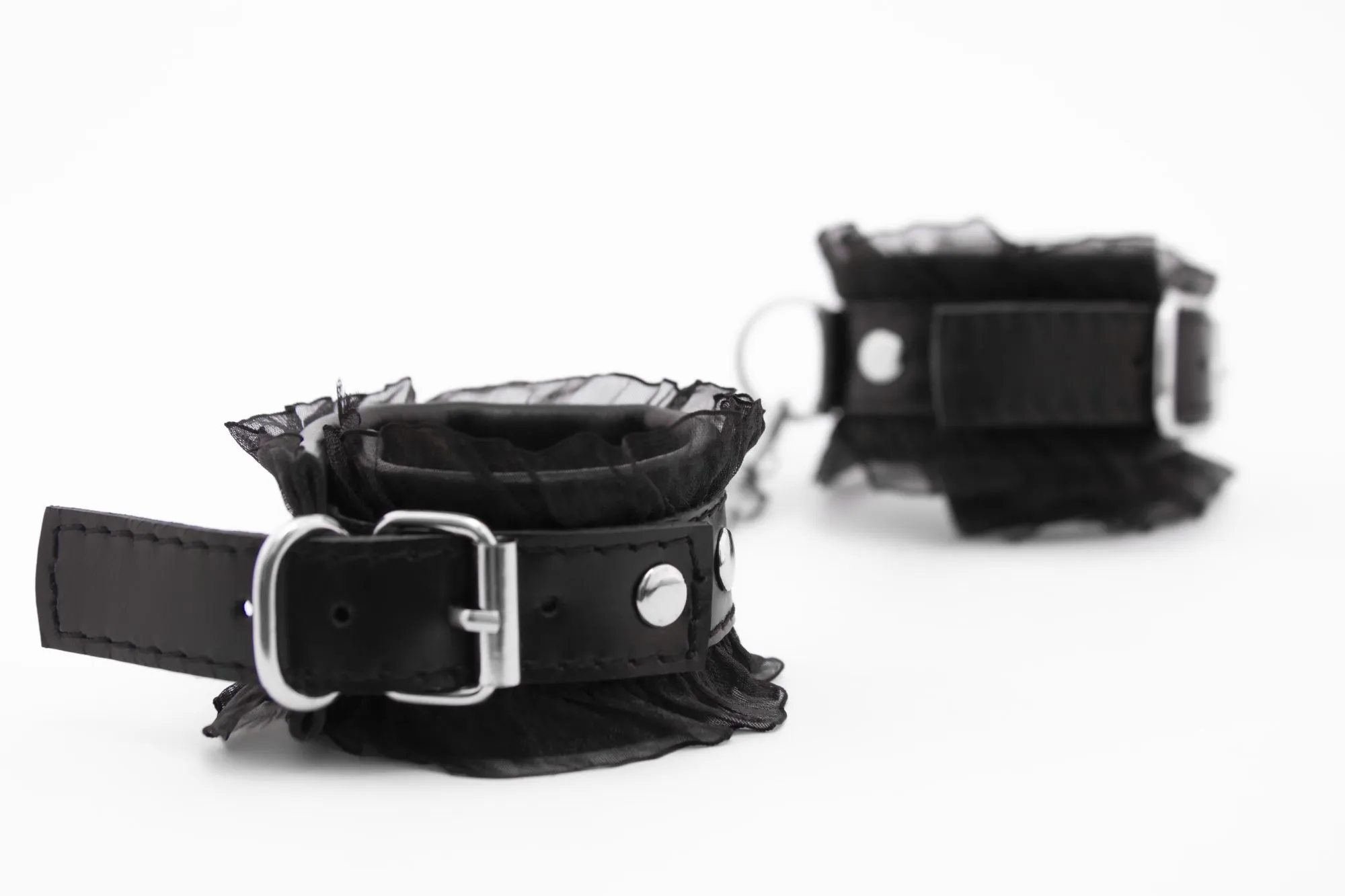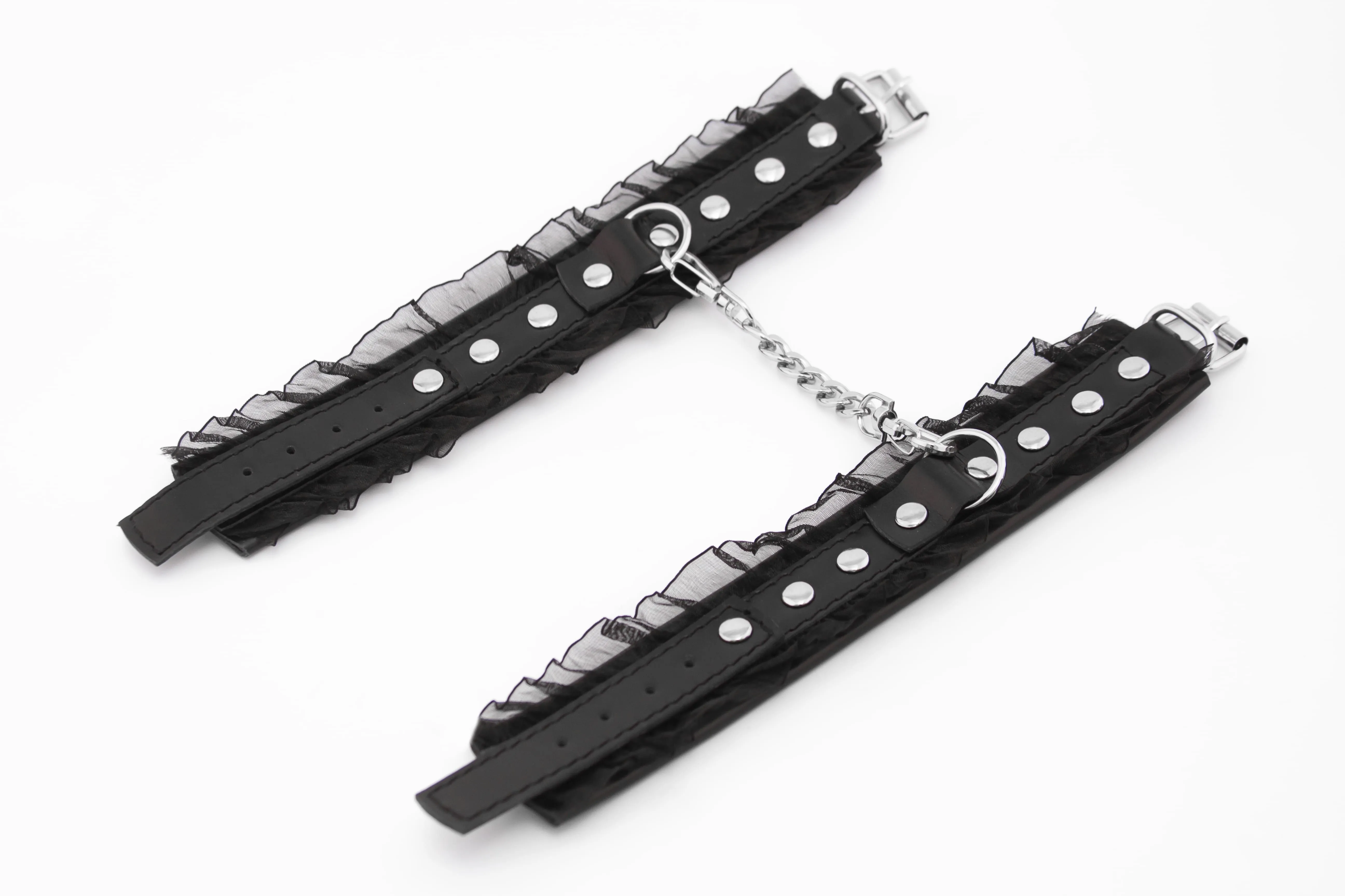 Наручники выполнены из натуральной кожи и дополнены нежным кружевом. Регулируются по размеру при помощи ремешков с пряжками. Эта модель является уменьшенной версией похожих наручников.