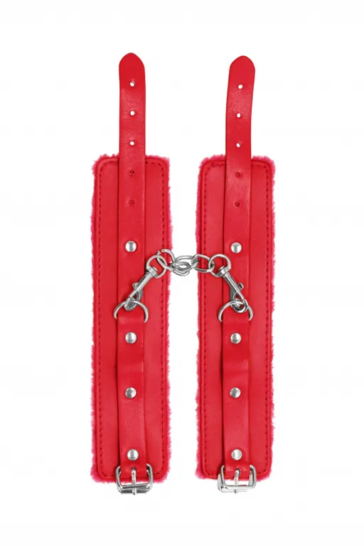 Наручники (оковы, фиксаторы) Plush Leather Hand Cuffs – кожаные наручники с цепочкой, предназначенные для ограничения свободы движения партнера во время эротических игр, а также в БДСМ практиках. Выполненные в классическом стиле с ремешком для фиксации и мягкой плюшевой подкладкой. Манжеты декорированы металлическими клепками и оснащены D-кольцами, к которым с помощью универсальных карабинов присоединяется короткая цепочка.