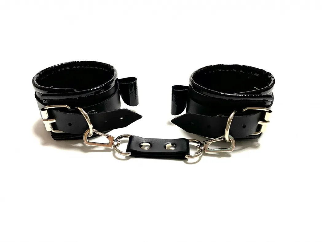 Красивые и функциональные наручники черного цвета, выполненные из искусственной кожи. Декорированы металлической фурнитурой, лаковыми бантиками и вставками по краям. Обхват удобно регулируется с помощью пряжек. Ширина наручников 4,5см, общая длина наручника вместе с ремешком 30см. В комплекте идет соединение с карабинами, общая длина соединения 11см. Очень экономичный, экологичный и практически незаменимый аксессуар для вашей любовной игры! Материал: эко-кожа, металл Цвет: черный