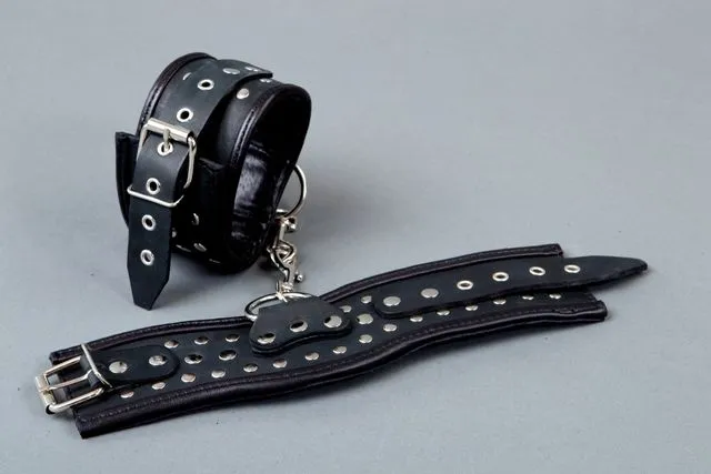Обездвижьте своего партнера при помощи этих поножей от компании Подиум, добавив в свою интимную жизнь немного остроты! Поножи выполнены из натуральной кожи черного цвета и декорированы металлическими клепками. Они имеют анатомическую форму и мягкую подкладку, поэтому не причинят дискомфорта при ношении. В центре каждого поножа есть специальное полукольцо, к которому можно присоединять различные аксессуары. Размер регулируется при помощи ремешков с пряжками.