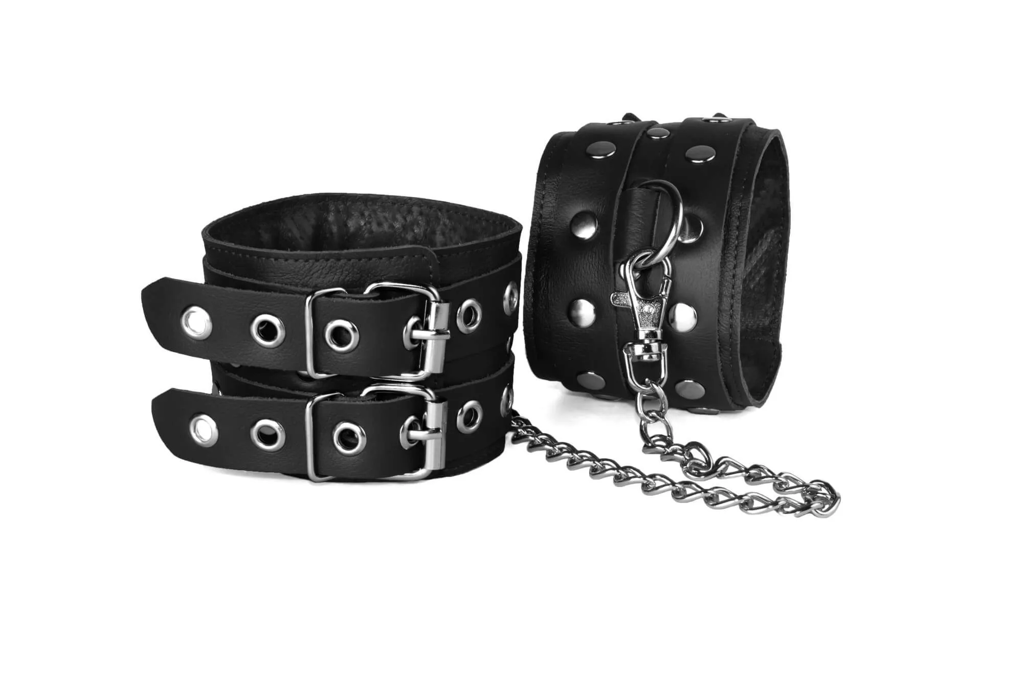 Поножи от бренда Sitabella выполнены из натуральной кожи и декорированы металлическими клепками. Между слоем основы и велюровой подкладкой проложена мягкая прокладка, благодаря которой носить их будет комфортно. Оковы соединены между собой при помощи цепи длиной 35 см с двумя карабинами на концах. Размер регулируется при помощи ремешков с пряжками.