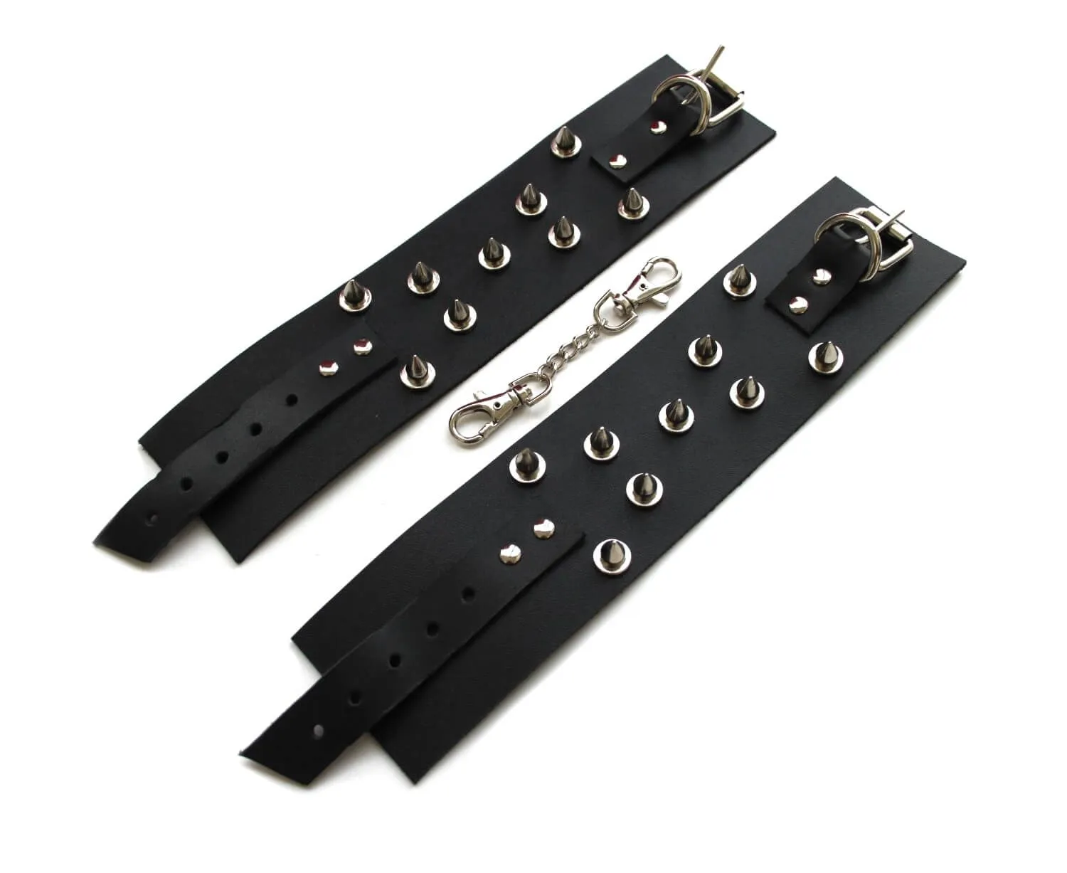 Поножи от бренда Pink Rabbit сделаны из натуральной кожи черного цвета и соединены между собой при помощи короткой цепи с карабинами. Они декорированы рядом металлических шипов, придающим им более дерзкий и агрессивный вид. Такой аксессуар позволит Вам обездвижить ноги своего партнера, лишив его возможности сопротивляться и препятствовать Вашим ласкам. Невозможность двигать ногами обострит все чувства партнера, делая его особенно чувствительным ко всем прикосновениям. Поножи разнообразят Ваши интимные игры и позволят испытать новые ощущения во время интимной близости.