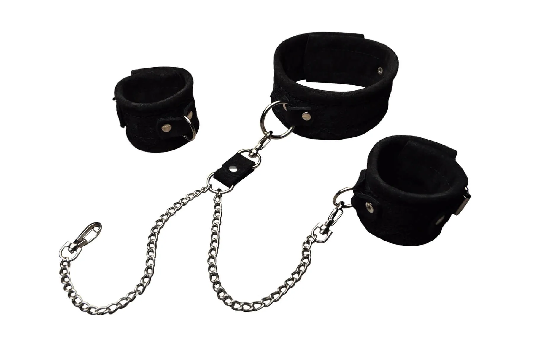 Между собой наручники и ошейник соединяются стяжкой с двумя цепочками. Размер регулируется при помощи ремешков с пряжками.