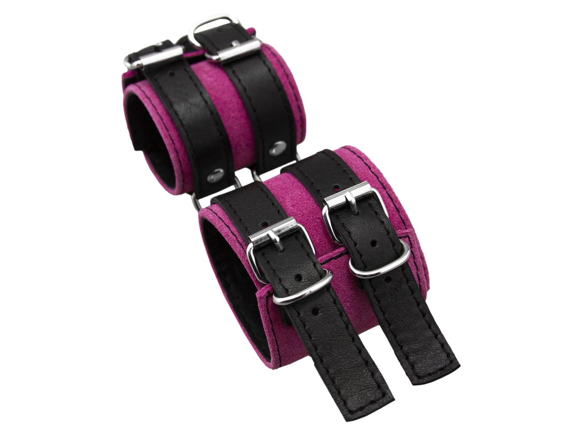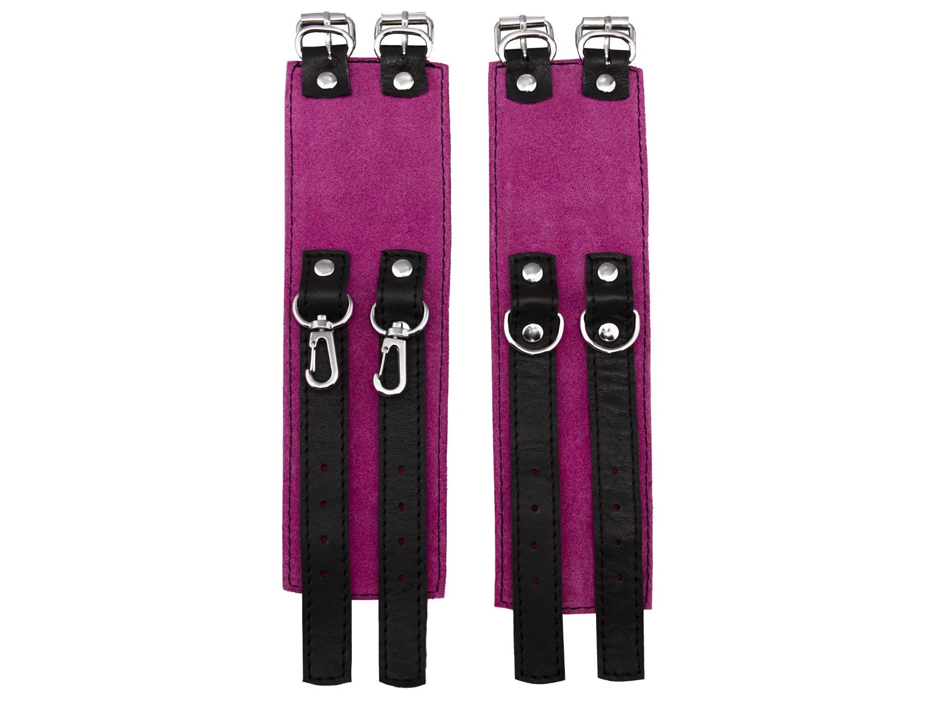 Наручники соединены между собой металлическими карабинами. Их можно регулировать по размеру ремешками с пряжками.