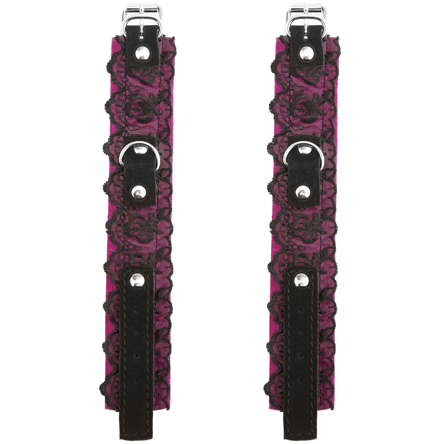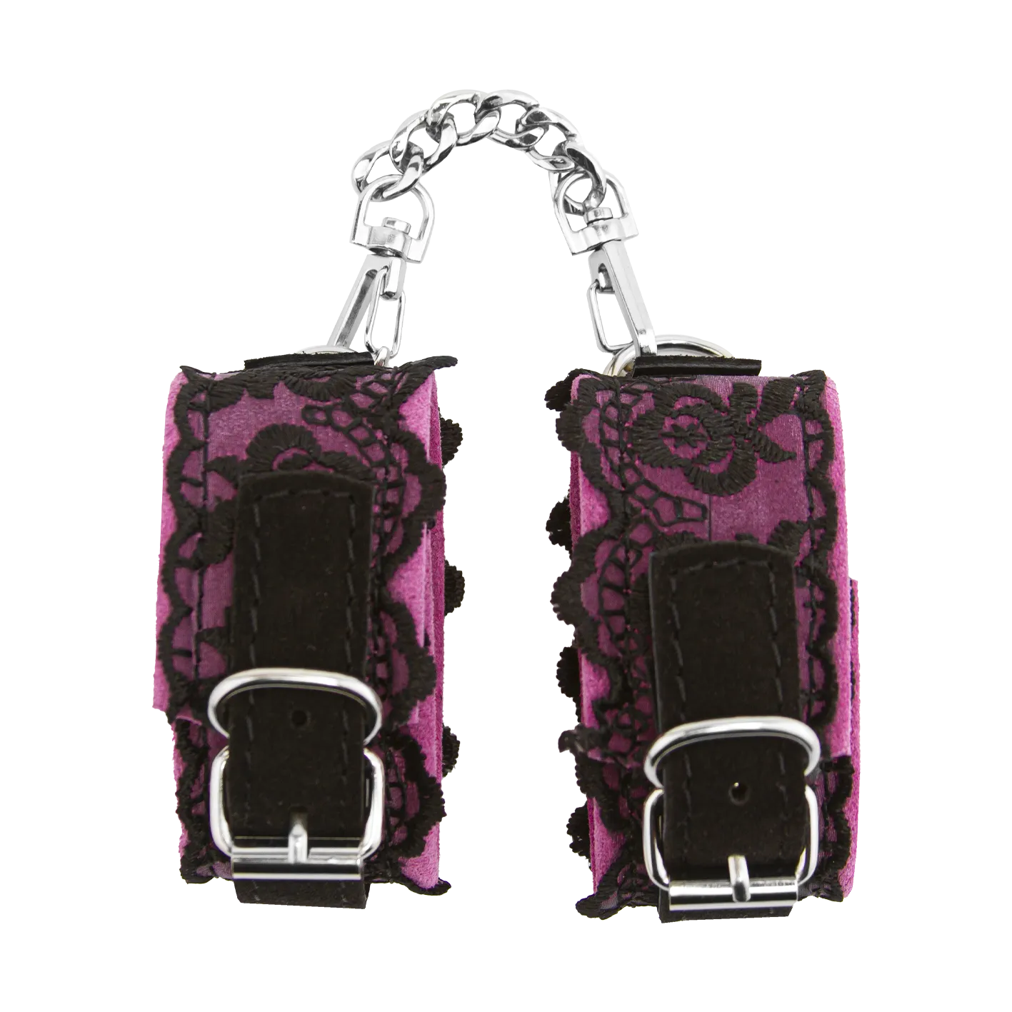 Наручники сделаны из замши и декорированы тонким кружевом. Они соединены между собой металлической цепочкой на карабинах. Наручники регулируются по размеру ремешками с пряжками.