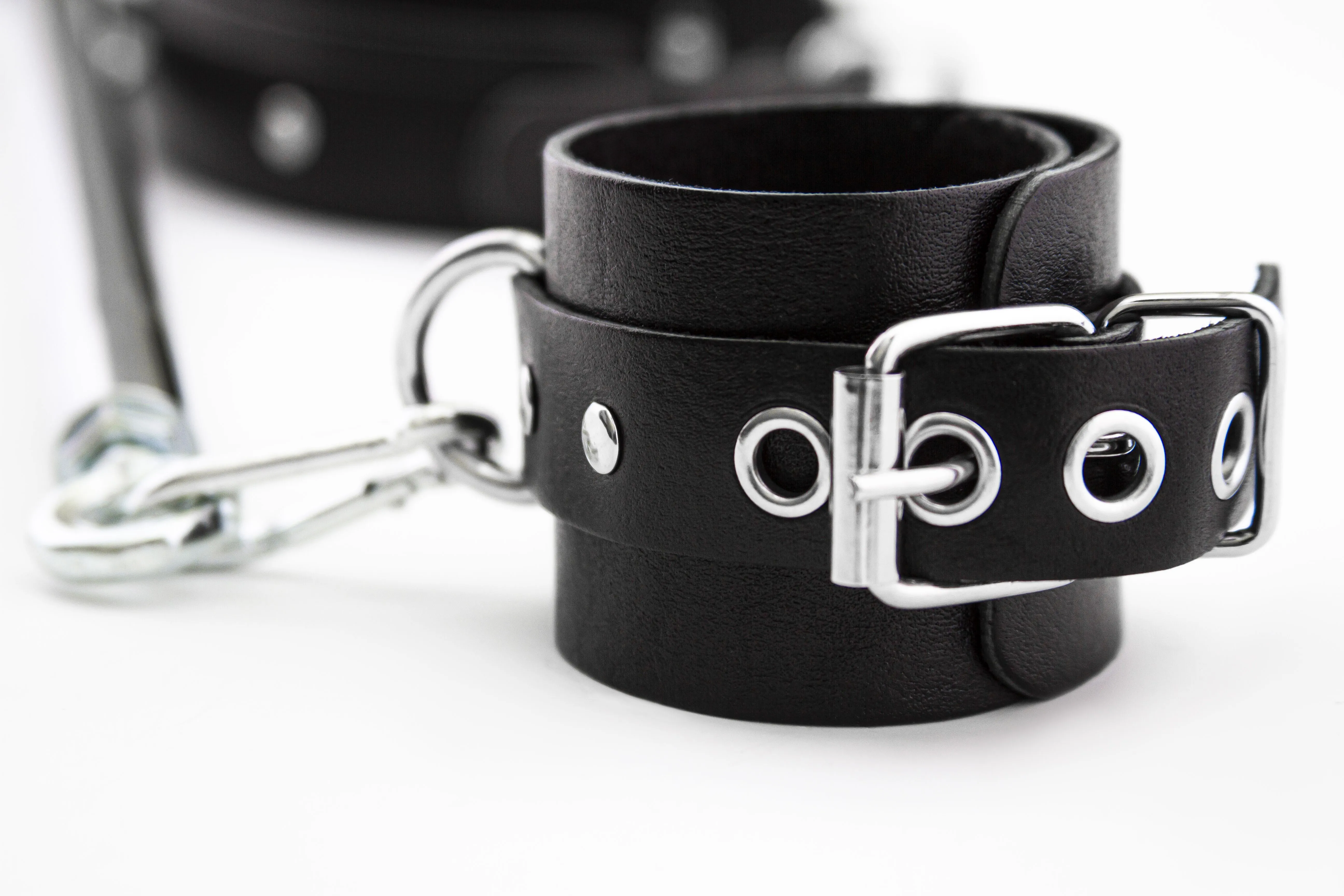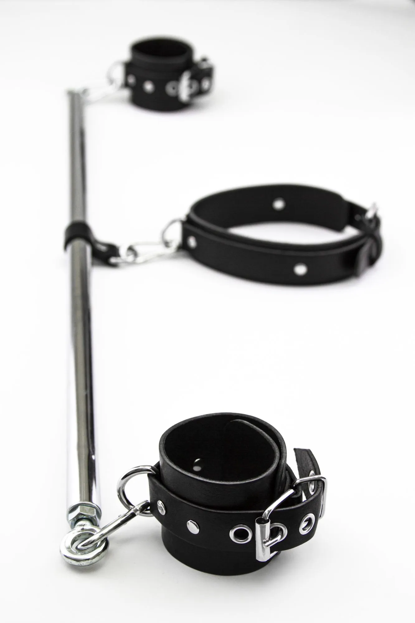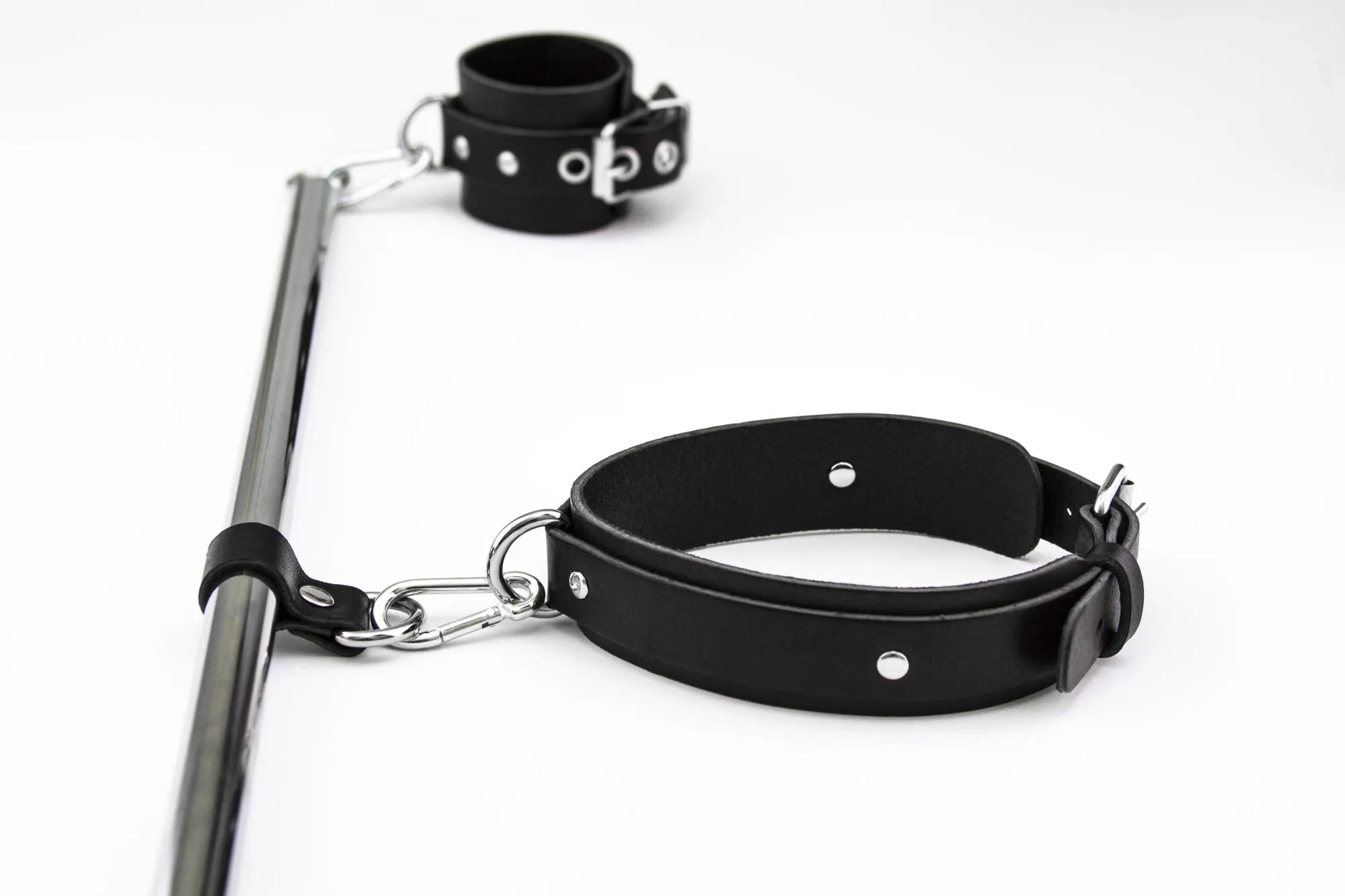 Наручники с ошейником на распорке позволят Вам прочно зафиксировать своего партнера в нужной позиции. Используя этот аксессуар, Вы сможете без труда обездвижить партнера, сломить его сопротивление и сполна насладиться его покорностью. Наручники с ошейником выполнены из мягкой кожи для более комфортного ношения. Их можно подогнать под нужный размер благодаря регулируемым ремешкам с пряжками.