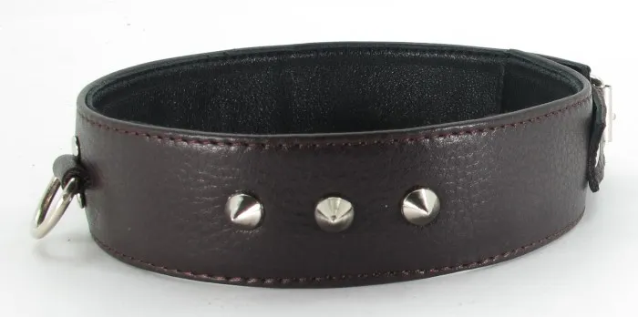 Ошейник для БДСМ игр в качестве наказания за провинность. Фетиш-изделие коричневого цвета с хромированными заклепками, которые добавляют аксессуару дерзости. В ошейник вставлено D-кольцо, с ними фетиш-изделие соединяется с бандажом или поводком. Вы символически посвящаете партнера в сексуальное рабство, ведущая роль всецело принадлежит именно Вам. Характеристики ошейник кожаный с клепками: цвет – коричневый, материал – кожа, макс. ширина в передней части – 3,8 см.