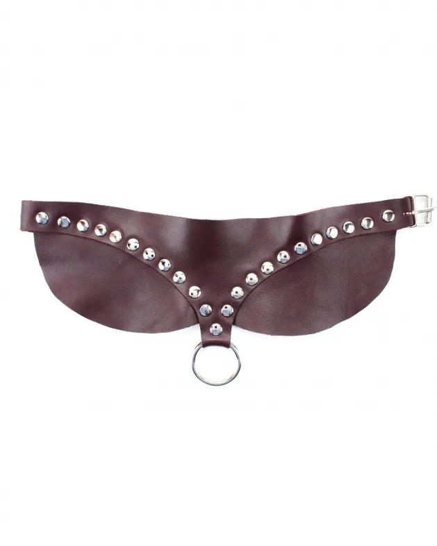 Ошейник выполнен из натуральной кожи бордового цвета, декорирован заклепками в иде V символа и металлическим кольцом спереди. Сзади аксессуар надежно фиксируется пряжкой, ремень позволяет выбрать нужный размер. Стильный аксессуар поможет воплотить эротические фантазии в реальность.