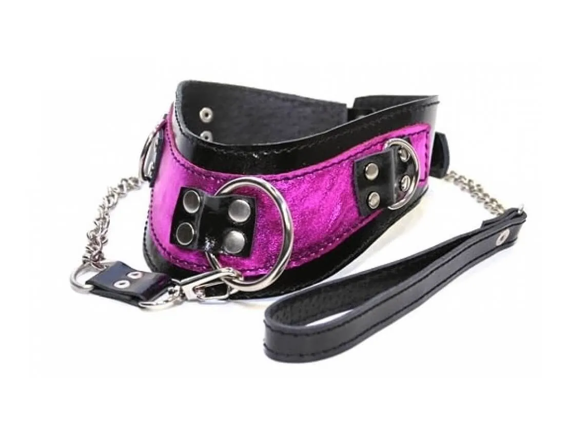 Этот ошейник имеет агрессивный вид и непременно внесет разнообразие острых ощущений в Ваши сексуальные игры. Ошейник выполнен из кожи черного и розового цветов и декорирован заклепками. Кроме этого он оснащен металлическим поводком, который пристегивается к кольцу на ошейнике с помощью карабина. Подчините партнера своим желаниям или подчинитесь ему сами с этим великолепным аксессуаром.