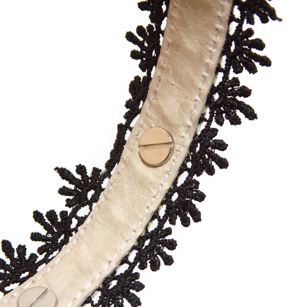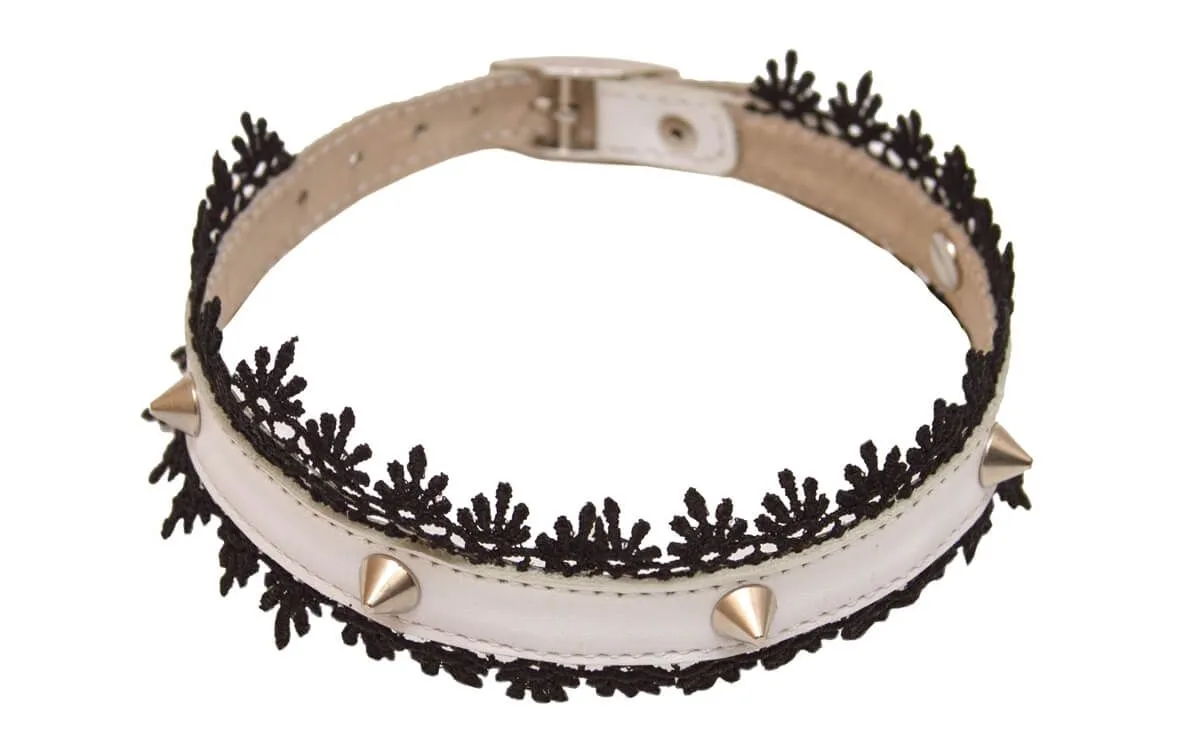 Ошейник выполнен из натуральной кожи белого цвета, украшен черным кружевом и металлическими шипами. Его размер можно регулировать застежкой. Ширина: 1,5 см.