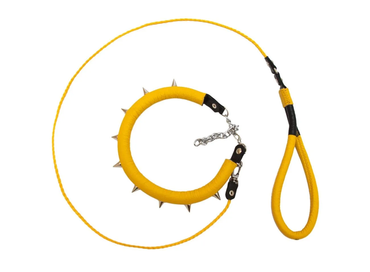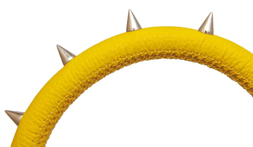 Оригинальный ошейник из натуральной кожи желтого цвета понравится любителям ролевых игр или игр с элементами БДСМ. Ошейник декорирован металлическими шипами, которые придают ему более дерзкий и провокационный вид. В комплекте с ошейником идет поводок с удобной петелькой для руки. При желании поводок можно отстегнуть, и тогда ошейник станет просто стильным украшением.