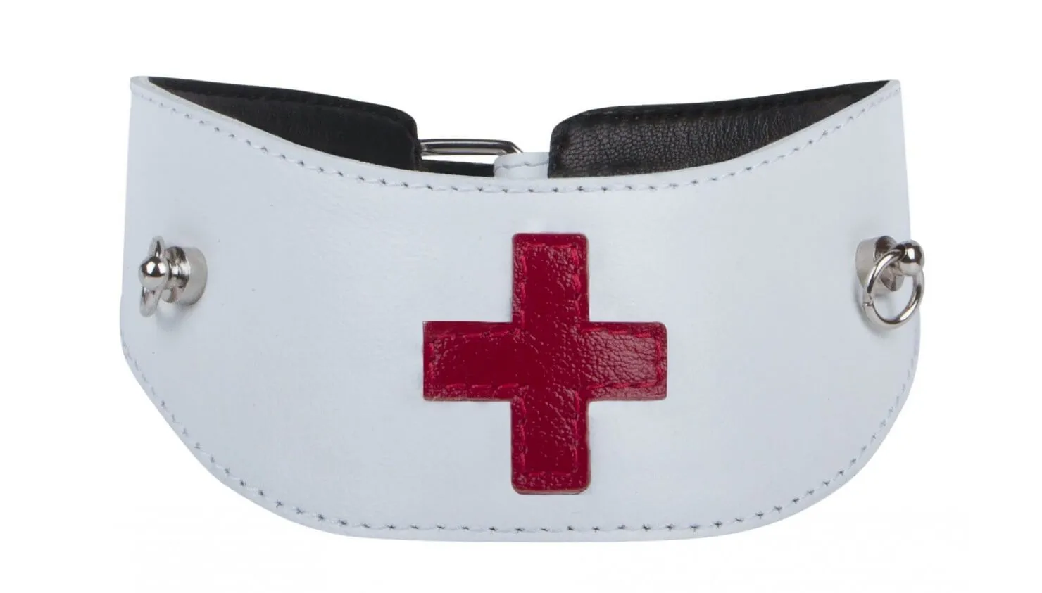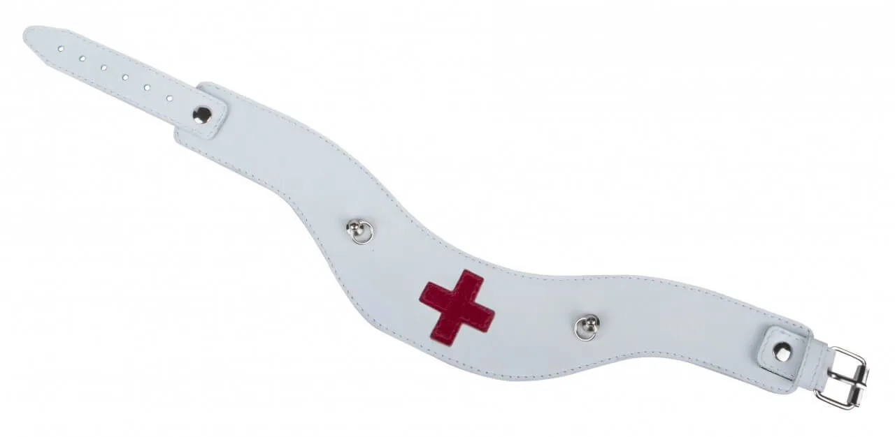Ошейник от компании Fire Horse поможет Вам разнообразить свою интимную жизнь и добавить в нее немного остроты, вне зависимости от того, есть ли у Вас опыт в играх с элементами БДСМ. Он выполнен из натуральной кожи белого цвета и декорирован красным крестом - характерным знаком скорой помощи. Благодаря этому ошейник станет отличным аксессуаром во время ролевой игры. У него есть два металлических кольца, к которым можно присоединить поводок или другие бондажные аксессуары при помощи карабина.