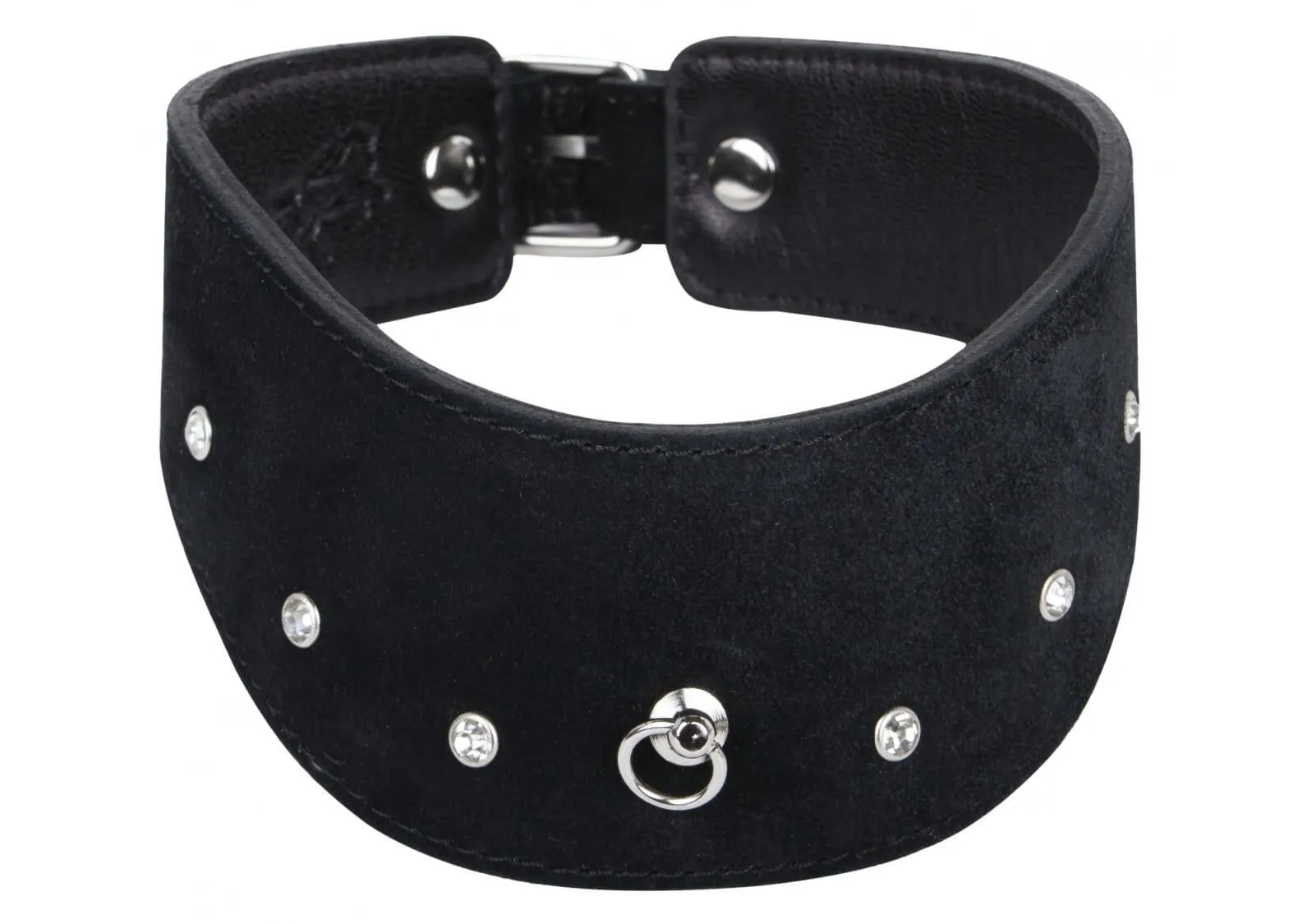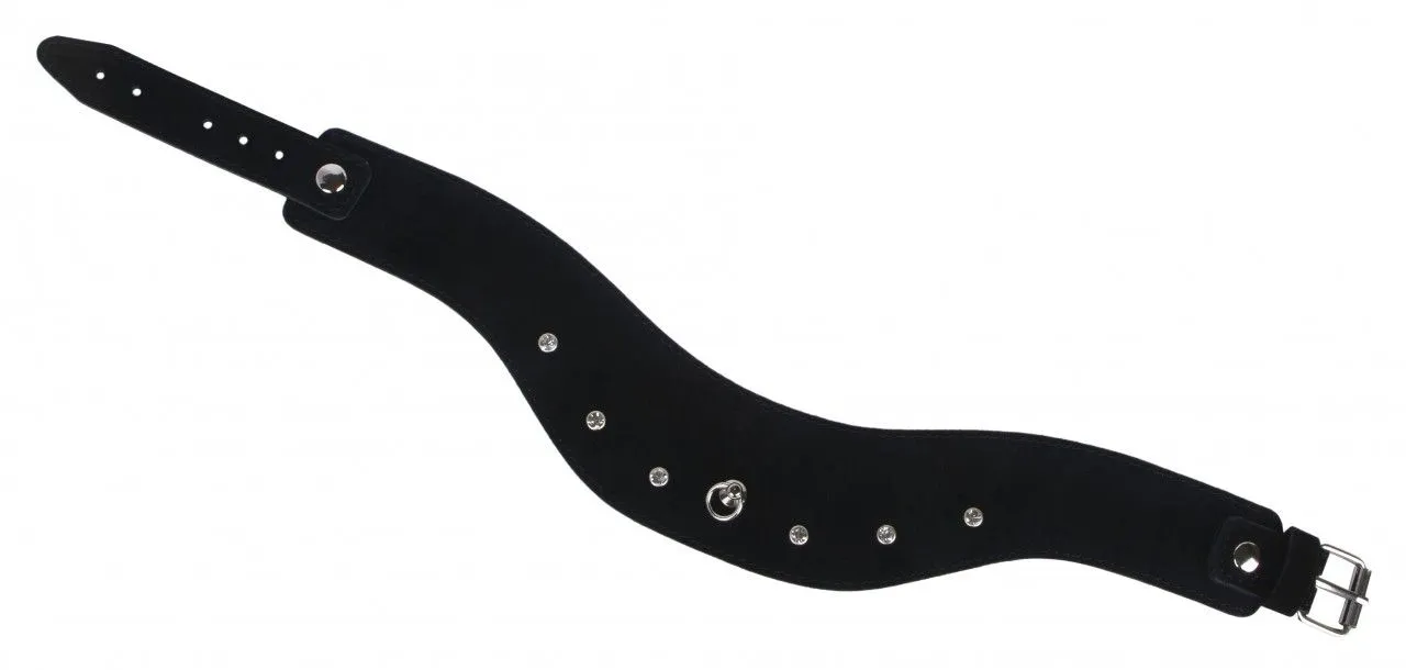 Ошейник от компании Fire Horse поможет Вам разнообразить свою интимную жизнь и добавить в нее немного остроты, вне зависимости от того, есть ли у Вас опыт в играх с элементами БДСМ. Он выполнен из натуральной черной замши А'нтэ, которая отличается бархатистостью и ровным густым ворсом. Ошейник декорирован блестящими стразами, придающими ему более эффектный вид. Также у него есть специальное колечко, которое может служить не только своеобразным украшением, но и местом крепления поводка или других бондажных аксессуаров. Ошейник регулируется по размеру.