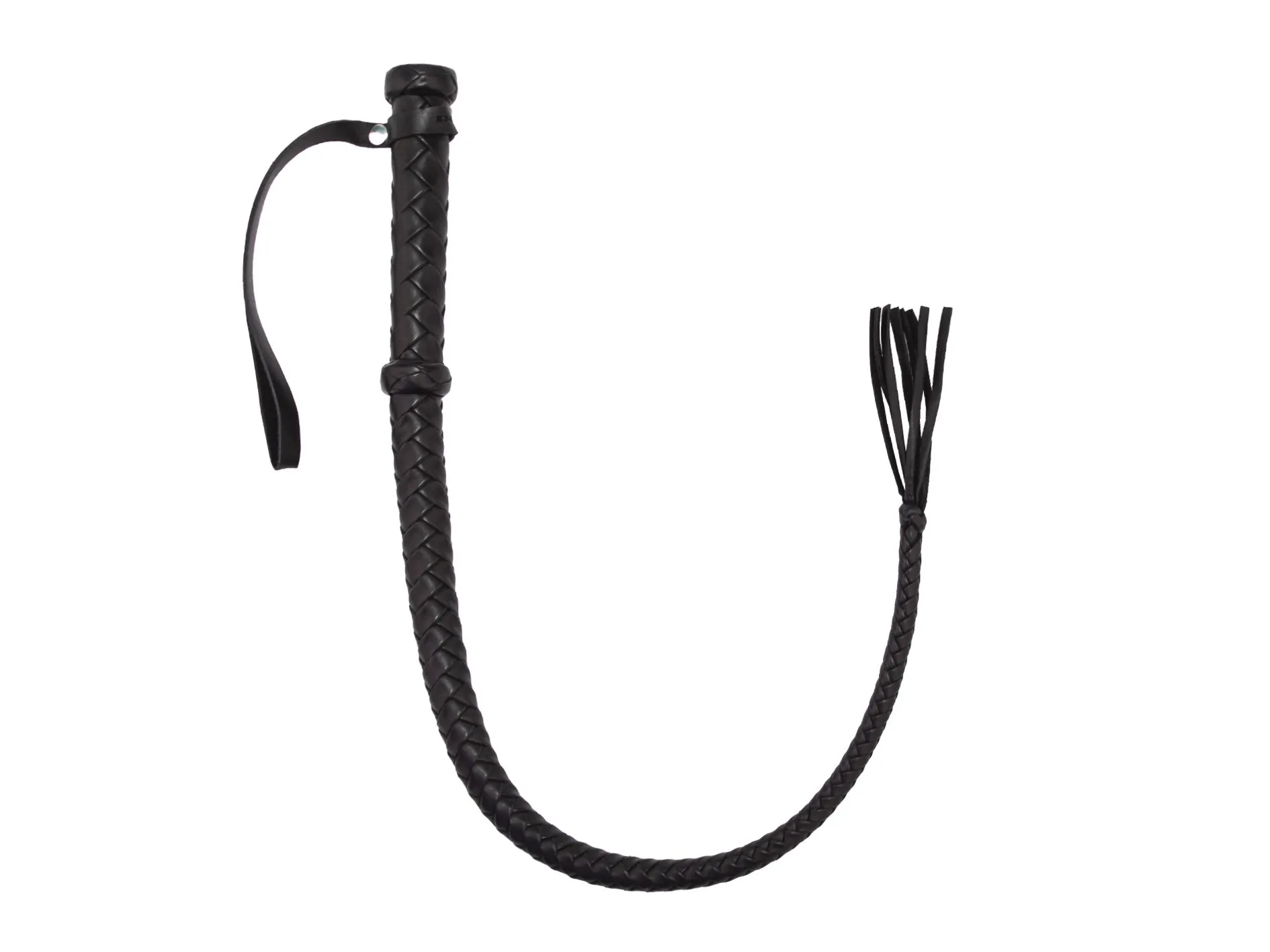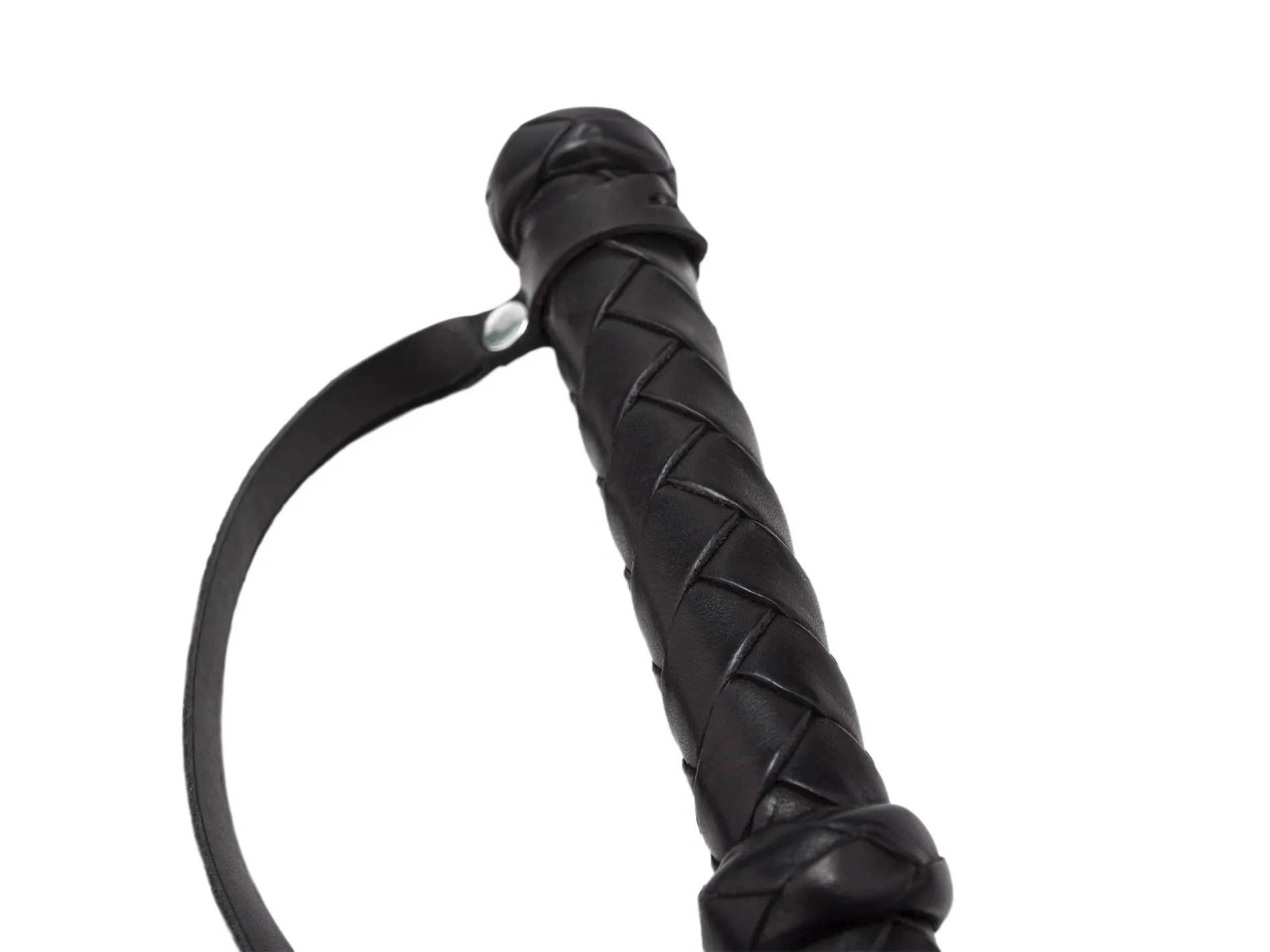 Кнут с жёсткой ручкой 190 мм с петлёй для фиксации руки, ограниченной двумя бобышками. Общая длина 650 мм. Натуральная кожа. При изготовлении кнута использовалось восьмиполосное плетение "елочкой". На его конце есть узелок и короткая кисточка, которую можно будет применять как для нанесения ударов, так и для дразнящих поглаживаний. Используйте этот аксессуар для нанесения ощутимых ударов, чтобы партнер прочувствовал все силу Вашей любви.