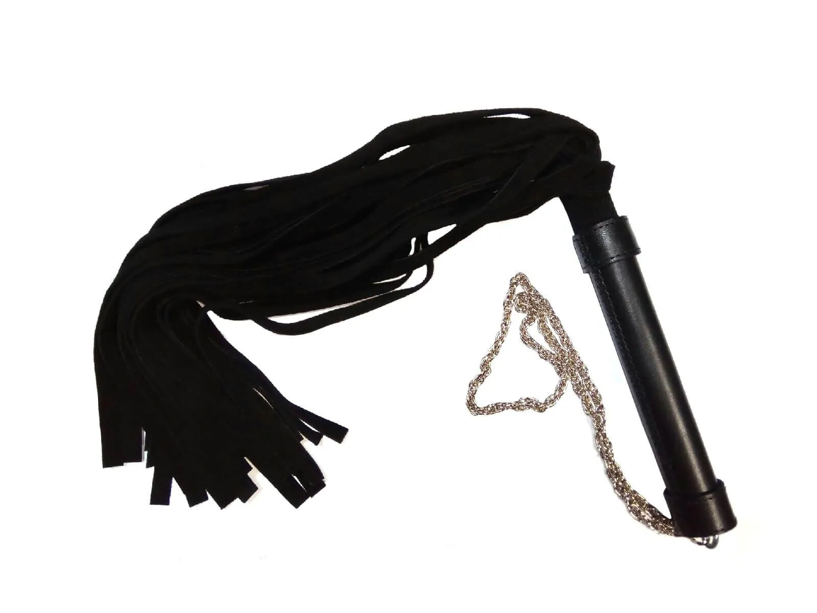 Плетка со множеством мягких хвостов идеально подойдет для тех, кто хочет попробовать что-то новое в постели и испытать яркие ощущения вместе с партнером. Ручка плетки выполнена из гладкой искусственной кожи, на ее конце есть металлическая цепочка, которую для удобства можно надеть на запястье. Также ручка украшена черепом, придающим плетке более агрессивный вид. Хвосты сделаны из искусственной замши - они достаточно мягкие, поэтому при помощи них можно дразнить своего партнера, поглаживая его или нанося более ощутимые удары.