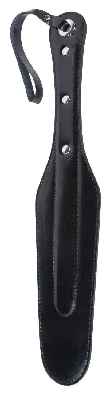 Пэддл выполнен из натуральной кожи черного цвета, а его ручка декорирована металлическими клепками. На конце пэддла есть специальная петелька для запястья, которая не позволит выронить его в самый неподходящий момент.
