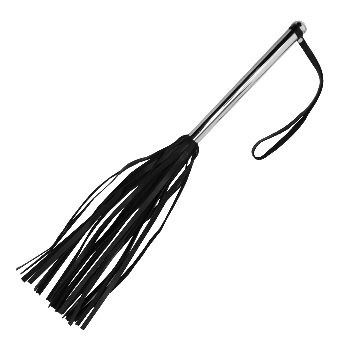 Флоггер выполнен из натуральной кожи черного цвета, а ручка - из гладкого металла серебристого цвета. На ручке имеется кожаная петелька для запястья, благодаря которой плеть не выскользнет из Ваших рук.