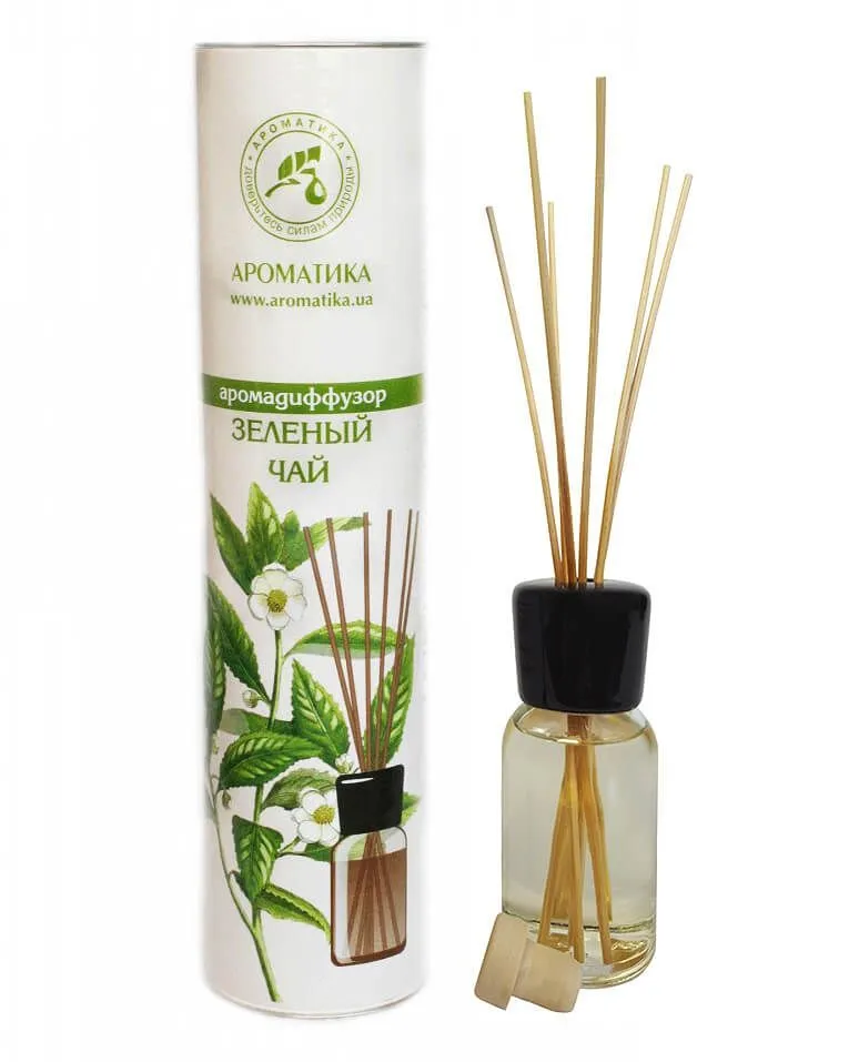Аромадиффузор в тубусе с комплектом бамбуковых палочек от бренда "Ароматика" наполнит помещение освежающим ароматом зеленого чая и избавит его от посторонних специфических запахов. В