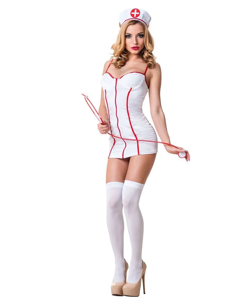 Костюм сексуальной медсестрички от компании Le Frivole состоит из белого облегающего платья на молнии, которое ляжет точно по фигуре и подчеркнет самые прекрасные изгибы женского тела. Костюм выполнен в традиционных цветах для костюма медсестры - красном и белом. Короткое платье украшено тремя красными вертикальными полосками, благодаря которым силуэт визуально будет казаться более стройным. Халатик без бретелек и полностью открывает область декольте. Наряд можно дополнить чулками, чтобы выглядеть еще более соблазнительно!