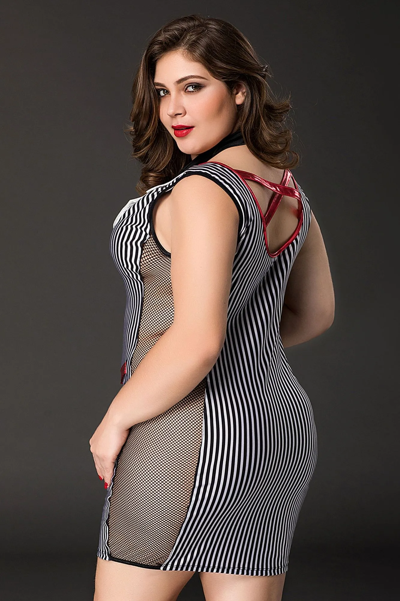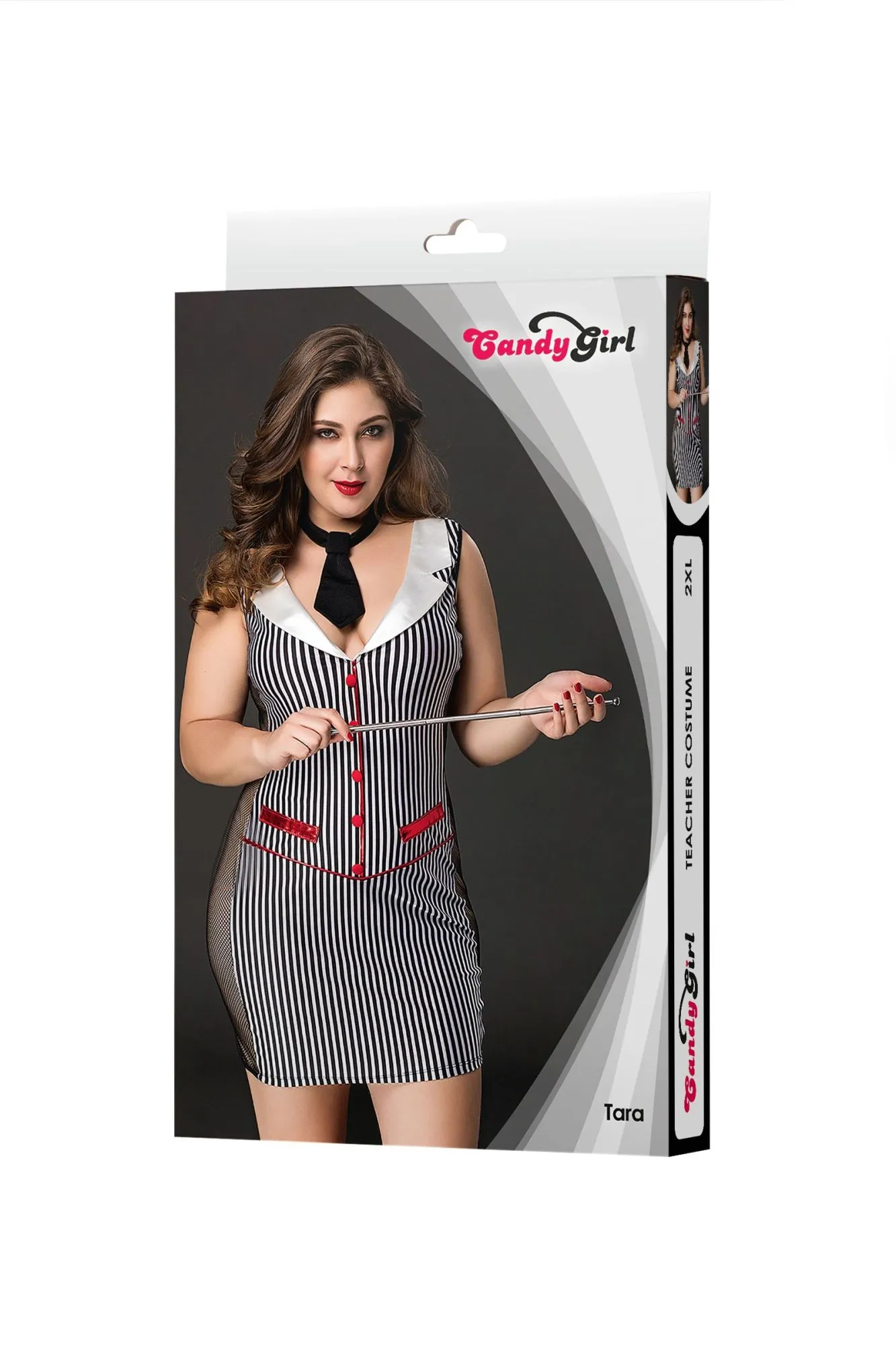 Эластичное платье учительницы с сеточными вставками по бокам Tara от Candy Girl® зрительно вытягивает силуэт и представляет фигуру в выгодном свете. Костюм декорирован контрастными деталями: пуговицами, клапанами фальш-карманов, продольной отделкой спереди и перемычками на спине. Отложной сатиновый воротник, трикотажный галстук на кнопке и телескопическая указка дополняют образ. Трикотажные G-стринги входят в комплект.