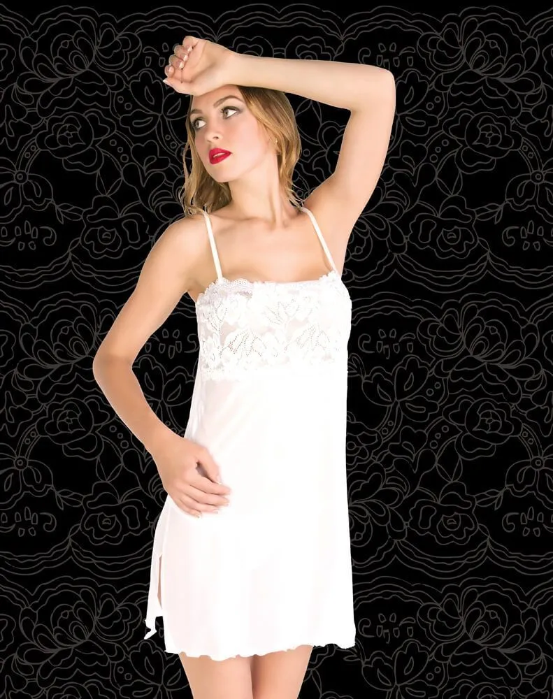 Элегантная сорочка Julia от бренда Flirton выполнена из тончайшей полупрозрачной сетки и декорирована кружевом с цветочным узором. По-воздушному легкая комбинация сможет подчеркнуть Вашу женственность и соблазнительность, а также поможет создать романтичную атмосферу. Лиф, украшенный кружевом, добавит Вашему образу нежности, а разрезы по бокам тонко намекнут о Ваших желаниях этой ночью. Такой наряд подойдет как для горячей ночи с любимым, так и для повседневного сна.