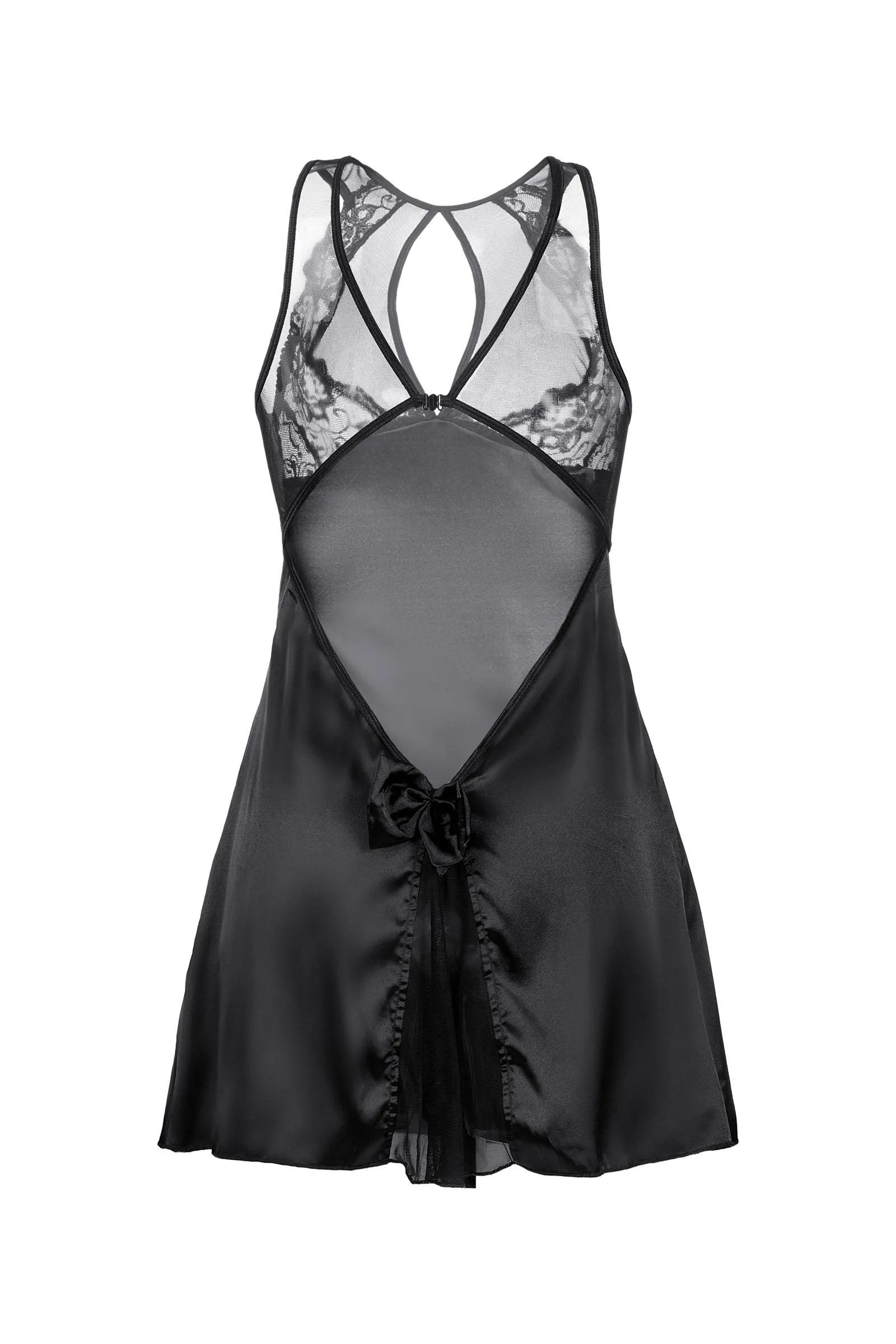 Сексапильная комбинация Princess от Candy Girl® вряд ли оставит в покое воображение партнёра. Сочетание блестящего сатина и прозрачной сеточки на лифе, спинке и на юбке будоражат и соблазняют. Женственный силуэт визуально добавляет стройности. Бюст украшен кружевом, а интригующие вырезы на спине дополнены застежкой и игривым бантиком. Подходящие стринги входят в комплект.