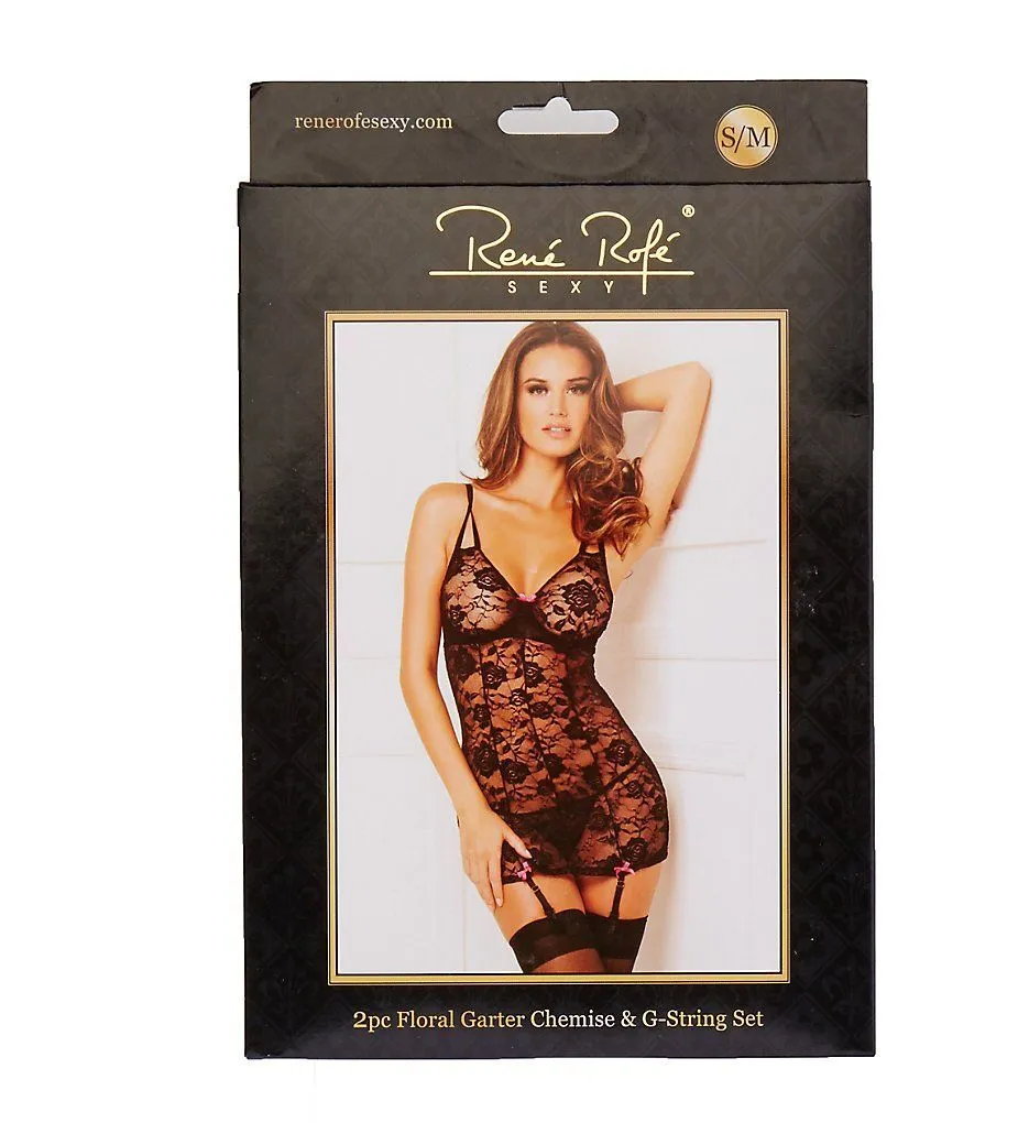 Невероятно сексуальный комплект белья от компании Rene Rofe состоит из сорочки с подтяжками для чулок и трусиков. Сорочка выполнена из тонкого черного кружева с цветочным мотивом и декорирована пикатными розовыми бантиками. Она будет идеально облегать тело, выделяя все достоинства Вашей фигуры. Благодаря наличию подтяжек, Вы сможете дополнить свой образ чулками, сделав его еще более соблазнительным. Бретельки сорочки регулируются, а лиф застегивается на крючки.