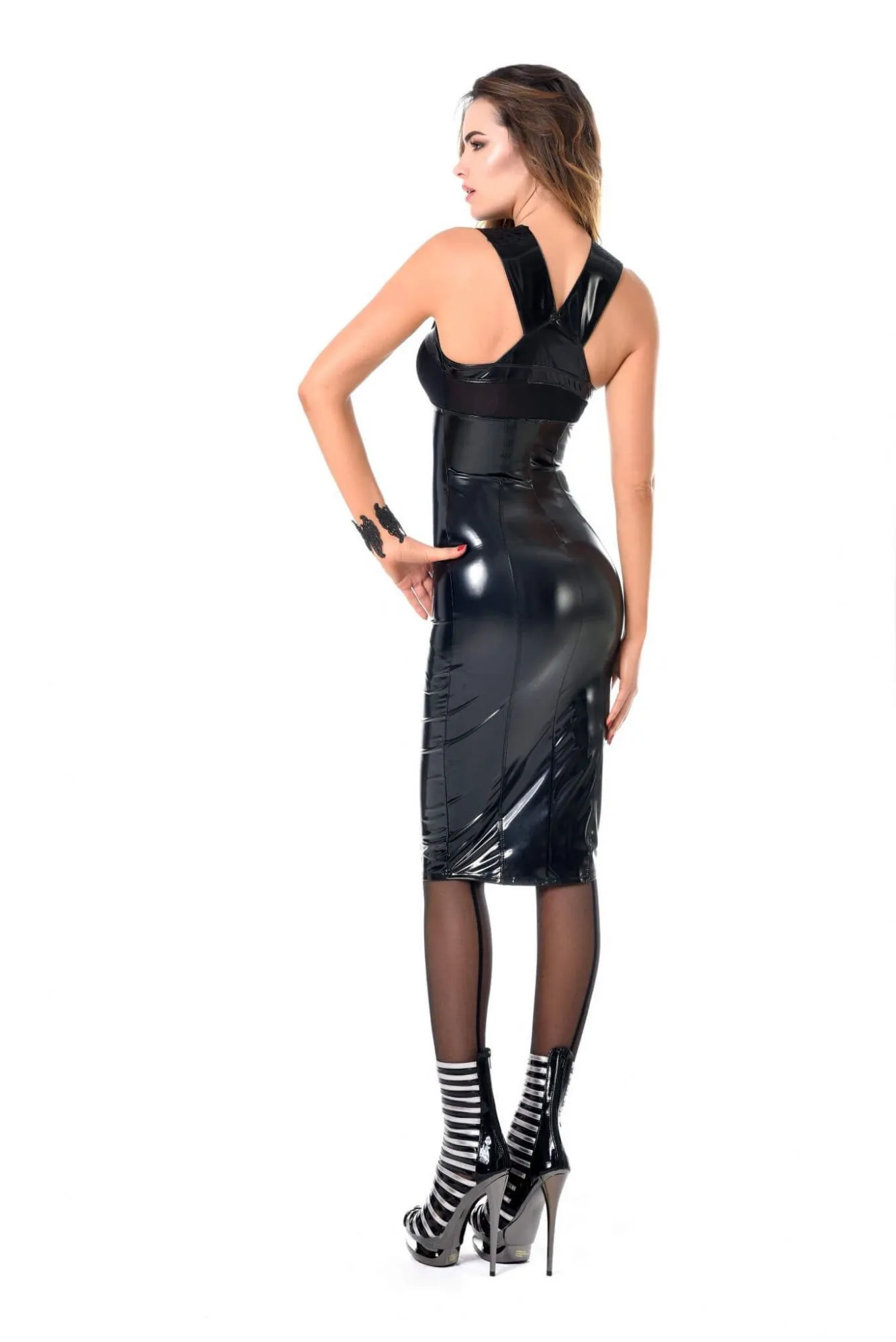 Элегантное длинное платье Lowani от французского дизайнера Patrice Catanzaro выполнено из блестящего черного материала и вставки из полупрозрачной ткани в области груди. Бюст соблазнительно прикроют широкие лямки, украшенные кружевом с растительным орнаментом. Платье будет прекрасно облегать фигуру, подчеркивая все изгибы Вашего тела, а вертикальные швы визуально сделают фигуру более стройной. Оно будет отлично смотреться на Вас вечеринке или на свидании с возлюбленным. Молния располагается спереди и доходит до самой груди.