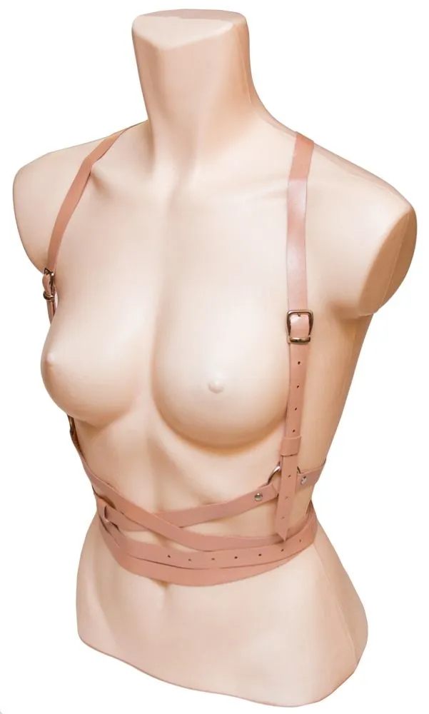 Портупея с двойным ремнем подойдет для повседневного ношения поверх одежды, а также для создания необходимого образа во время ролевых игр. Портупея выполнена из натуральной кожи светло-розового цвета, спереди ее украшает переплетение ремней с пряжками, а сзади ремни на талии накладываются один на другой. Надев данный аксессуар, Вы сможете подчеркнуть свой дерзкий стиль и раскрыть всю страстность своей натуры.
