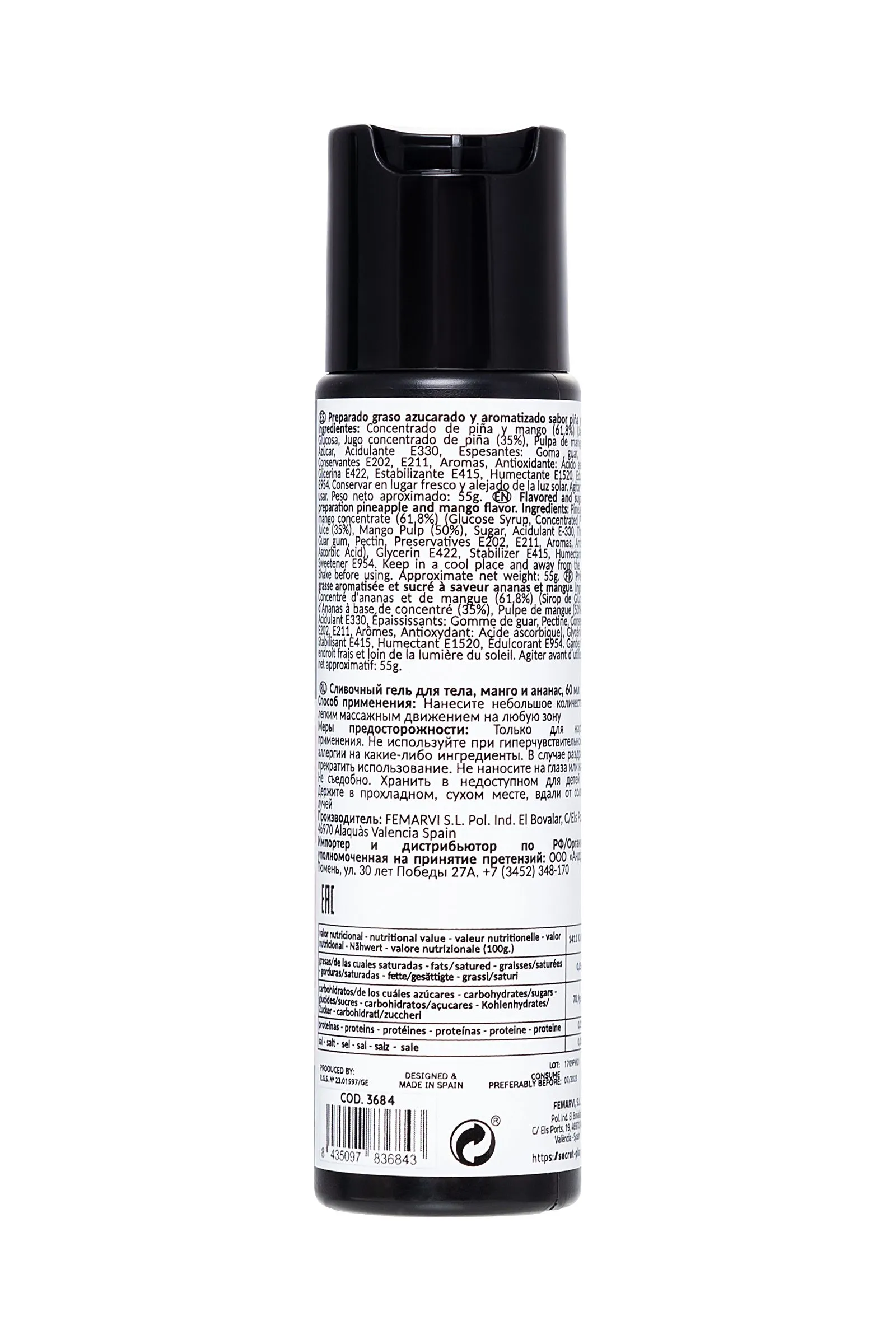 ИНТИМНЫЙ ГЕЛЬ MANGO & PINEAPPLE GEL - 60 ML "SWEET LOVE" Сладкая любовь – этот смазывающий гель MANGO & PINEAPPLE GEL "SWEET LOVE" идеально подходит для того, чтобы вы таяли от удовольствия. Сладкий и восхитительный аромат манго и ананаса, который заставит вас не переставать облизывать и целовать своего партнера. MANGO & PINEAPPLE GEL "SWEET LOVE" - с ним вы можете путешествовать губами по телу вашего партнера, так как они идеально подходят для всех эрогенных зон, сосков, шеи, яичек... Кремообразная текстура этого геля обладает превосходными смазочными свойствами. Кроме того, секрет MANGO & PINEAPPLE GEL "SWEET LOVE" – идеально подходит для интимного массажа. Добавьте страсти и пикантного огонька в свою сексуальную игру. Гель очарует вас своим восхитительным вкусом манго и ананаса – аромат, перед которым трудно устоять. Емкость с системой «Disc-Top» Простое нанесение Объем: 60 мл (55 г) Вкус: манго и ананас Глицериновая основа Совместимость с презервативами и игрушками Состав: сладкий и ароматизированный жирный препарат ананас и ароматизатор манго, концентрированный ананас и манго (61,8%) (сироп глюкозы, концентрированный сок ананаса (35%), мякоть манго (50%), сахар, подкислитель е330, загустители: гуаровая камедь, пектин, консерванты e202, e211, ароматизаторы, антиоксидант: аскорбиновая кислота), глицерин e422, стабилизатор e415, увлажнитель e1520 Способ применения: Нанесите массирующими движениями на желаемую область. Меры предосторожности: Не используйте при гиперчувствительности или аллергии на какие-либо ингредиенты. В случае раздражения прекратить использование. Не наносите на глаза или на раны. Хранить в недоступном для детей месте. Держите в прохладном, сухом месте, вдали от солнечных лучей.