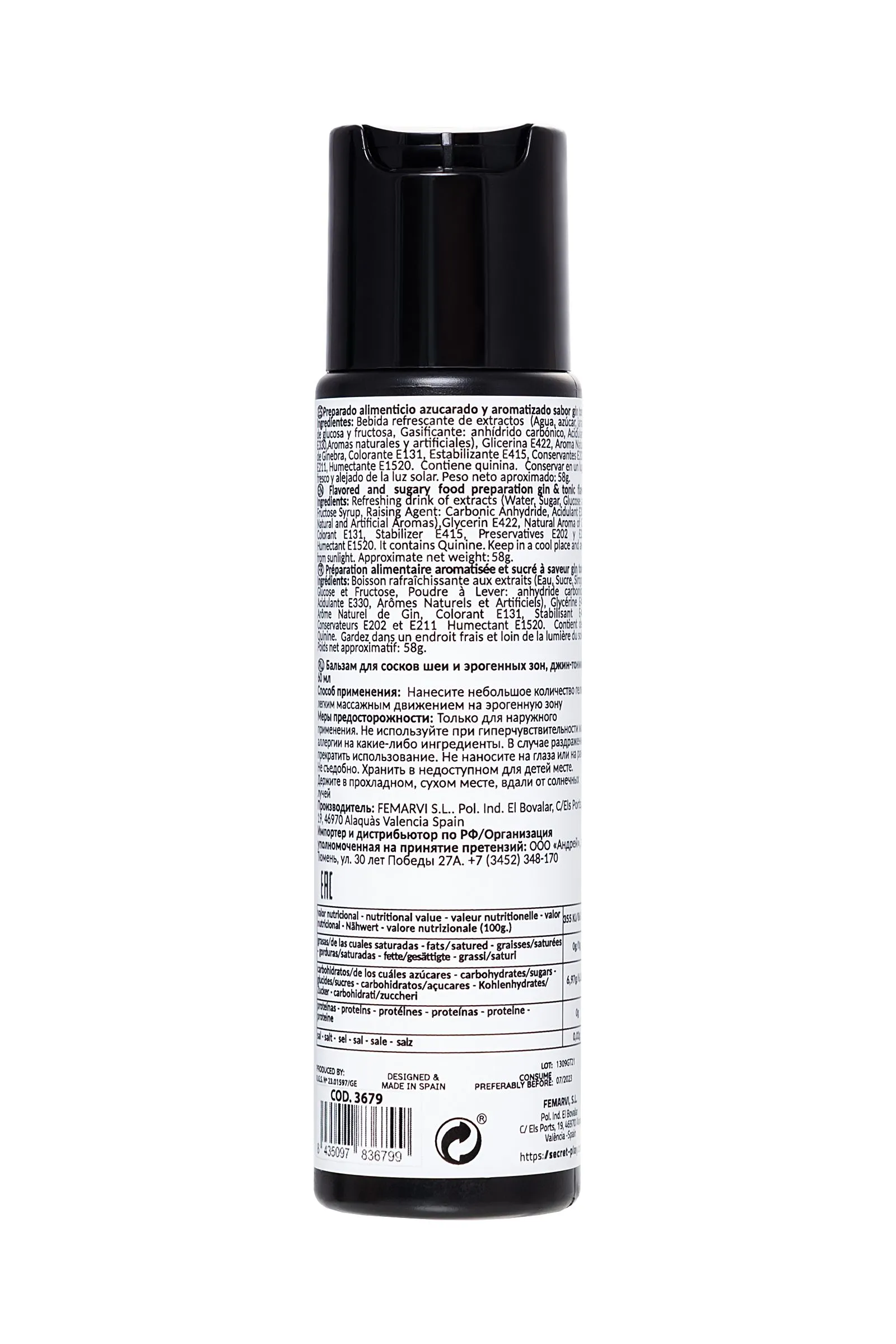 ИНТИМНЫЙ ГЕЛЬ СО ВКУСОМ джина-тоника GIN & TONIC BALM 60 ML "DRUNK IN LOVE" Безалкогольный гель на водной основе от Secret Play серии "DRUNK IN LOVE" Gin & Tonic Balm со вкусом джин-тоника идеально подходит не только для проникновения, но и для оральных ласк и стимулирования эрогенных зон. Необычный, слегка сладкий вкус и аромат дополнят сексуальную игру, с ним путешествовать по телу, облизывая и целуя эрогенные зоны, соски, шею, живот, станет намного интереснее. Кремообразная текстура этого геля обладает превосходными смазочными свойствами. Гель очарует своим восхитительным вкусом и ароматом освежающего джин-тоника – будет трудно устоять от соблазна совместить любовные игры с этим гелем. Емкость с системой «Disc-Top» Простое нанесение Содержание спирта 0% Объем: 60 мл (58 г) Вкус: джин-тоник Глицериновая основа Совместимость с презервативами и игрушками Состав: освежающий напиток с экстрактами (вода, сахар, сироп глюкозы и фруктозы, разрыхлитель: углекислый ангидрид, подкислитель е330, натуральные и искусственные ароматизаторы), глицерин е422, ароматизатор натуральный джин, краситель е131, стайзер е415, консерванты е202 и е211, увлажняющий крем. e1520. содержит хинин. Способ применения: Нанесите массирующими движениями на желаемую область. Меры предосторожности: Не используйте при гиперчувствительности или аллергии на какие-либо ингредиенты. В случае раздражения прекратить использование. Не наносите на глаза или на раны. Хранить в недоступном для детей месте. Держите в прохладном, сухом месте, вдали от солнечных лучей.