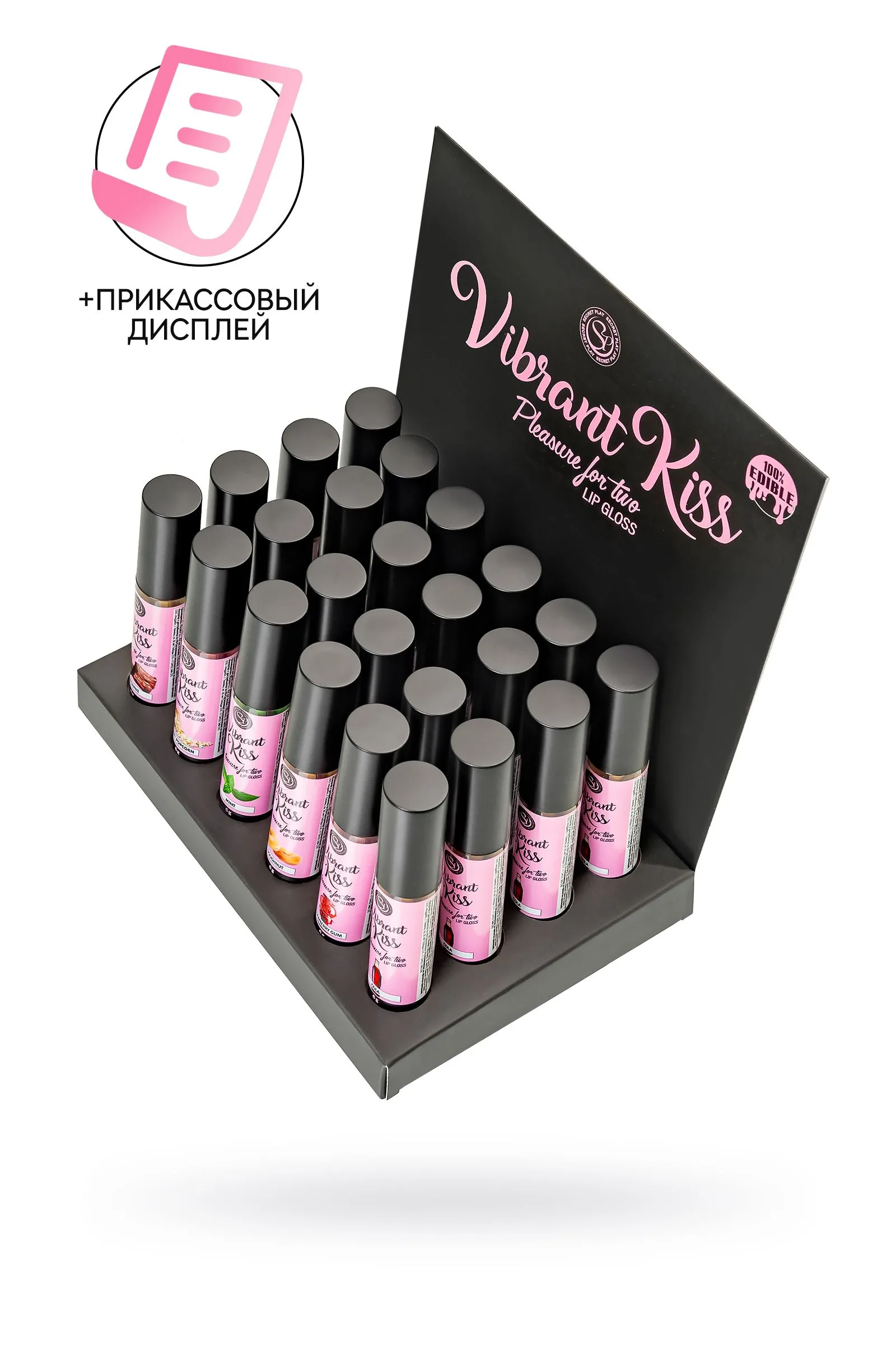 Восхитительные ощущения от сочетания сладкого поцелуя и волшебных мурашек дарят блески для губ Lip Gloss Vibrant Kiss. Ощущение взрыва, перед которым невозможно устоять. Блеск может доставить удовольствие обоим партнерам стимулирующими вибрационными волнами, которые ощутимы уже через несколько секунд после нанесения на губы. Его вибрационные волны вызывают приятное покалывание, которое способствует стимуляции нервных окончаний и повышает чувствительность эрогенных зон, увеличивая удовольствие. Партнер ощутит мурашки при поцелуе и в интимной зоне при оральном сексе. Кроме того, этот блеск придает 3D эффект губам, делая их более сочными и объемными. Стильный дисплей-подставка в цветах бренда гарантированно вызывает интерес покупателей. Установите дисплей в прикассовой зоне, чтобы эффектно оформить витрину. Выбирайте один из 6 восхитительных вкусов, или миксуйте разные сочетания, которые на 100% съедобны. Набор из 6 разнообразных вкусов и ароматов в специальном дисплее-подставке включает в себя: 4 блеска для губ Vibrant Kiss Strawberry Gum с умопомрачительным вкусом и ароматом клубничной жвачки, арт. 3653 4 блеска для губ Vibrant Kiss Mint – вкус и аромат сладкой освежающей мяты, арт. 3645. 4 блеска для губ Vibrant Kiss Brownie – вкус и аромат шоколадного печенья, арт. 3655 4 блеска для губ Vibrant Kiss Coke – вкус и аромат Колы, арт. 3657. 4 блеска для губ Vibrant Kiss Sweet Popcorn – вкус и аромат попкорна, арт. 3658. 4 блеска для губ Vibrant Kiss Doughnut – вкус и аромат пончика, арт. 3656. Способ применения: Нанесите на губы, через несколько секунд вы почувствуете стимулирующую вибрацию. Объем: 6 гр Глицериновая основа Совместимость с презервативами и игрушками 100% съедобно Перед использованием взболтать Сделано в Испании Меры предосторожности: Встряхните перед использованием. Не используйте при гиперчувствительности или аллергии на ингредиенты. Не наносите на глаза или на раны. Держись подальше от детей. Держите в прохладном, сухом месте, вдали от солнечных лучей. В случае раздражения прекратить использование.