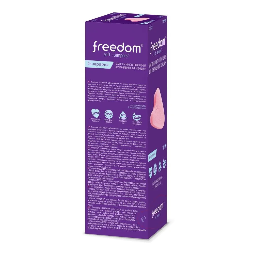 100% безопасный медицинский материал, разработанный для тампонов Фридом экспертным советом в Германии, не пересушивает слизистую и не травмирует ткани при введении и извлечении. Материал тампонов FREEDOM не увеличивается в размерах при впитывании. Вот прочему FREEDOM - это комфортные тампоны для секса и спорта, купания и активного образа жизни. Купание с тампоном, тренировки, фитнес и даже секс с тампоном – теперь ничто не помешает!