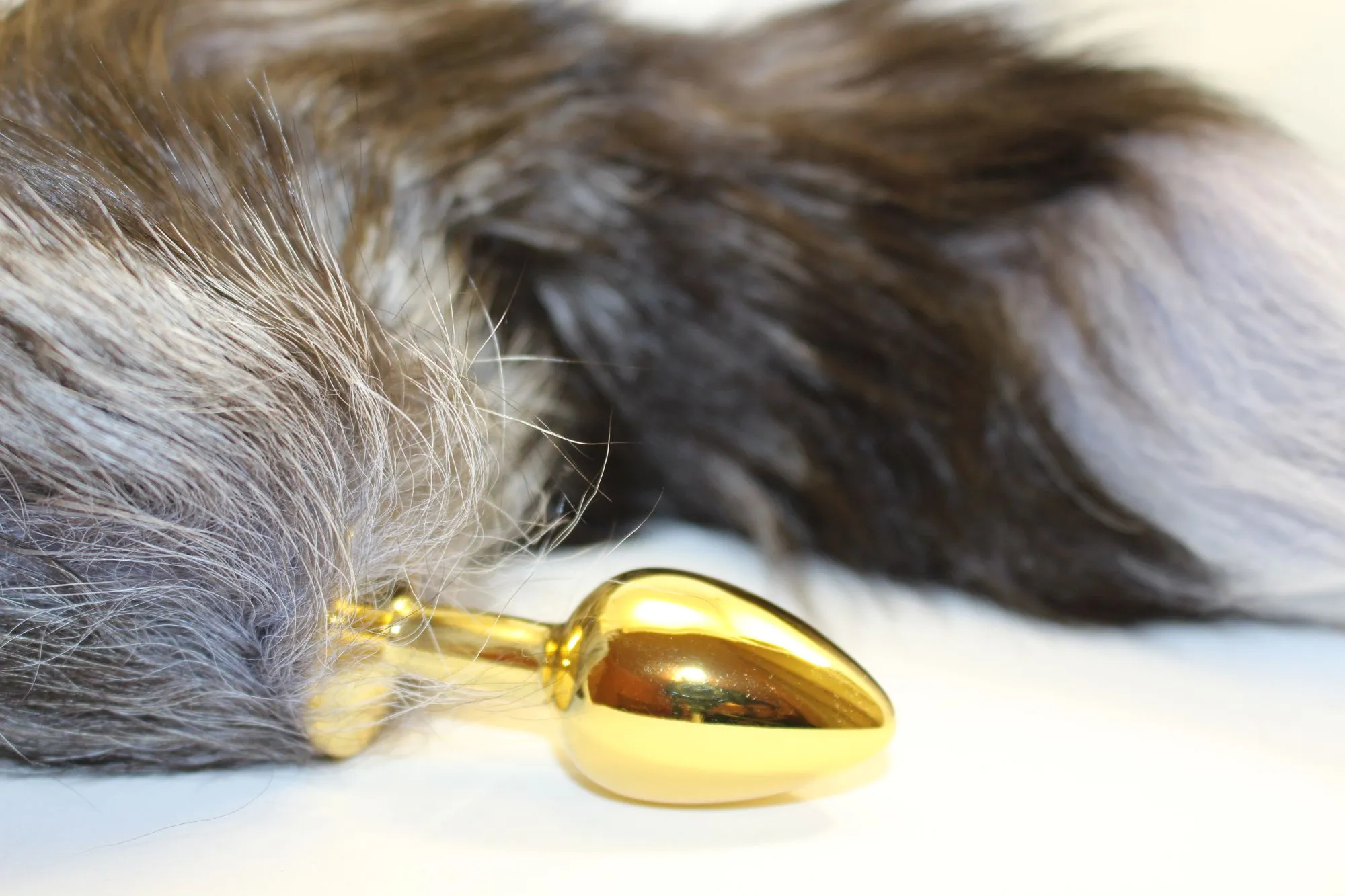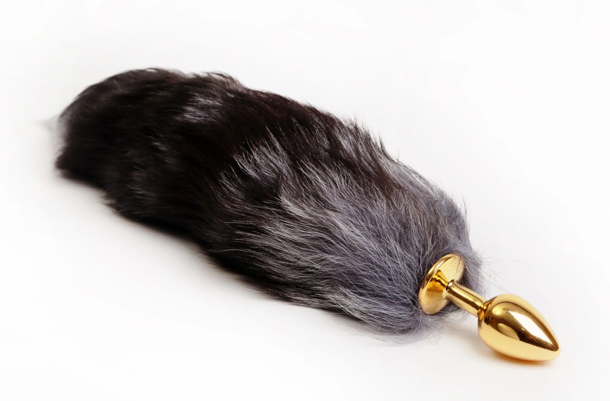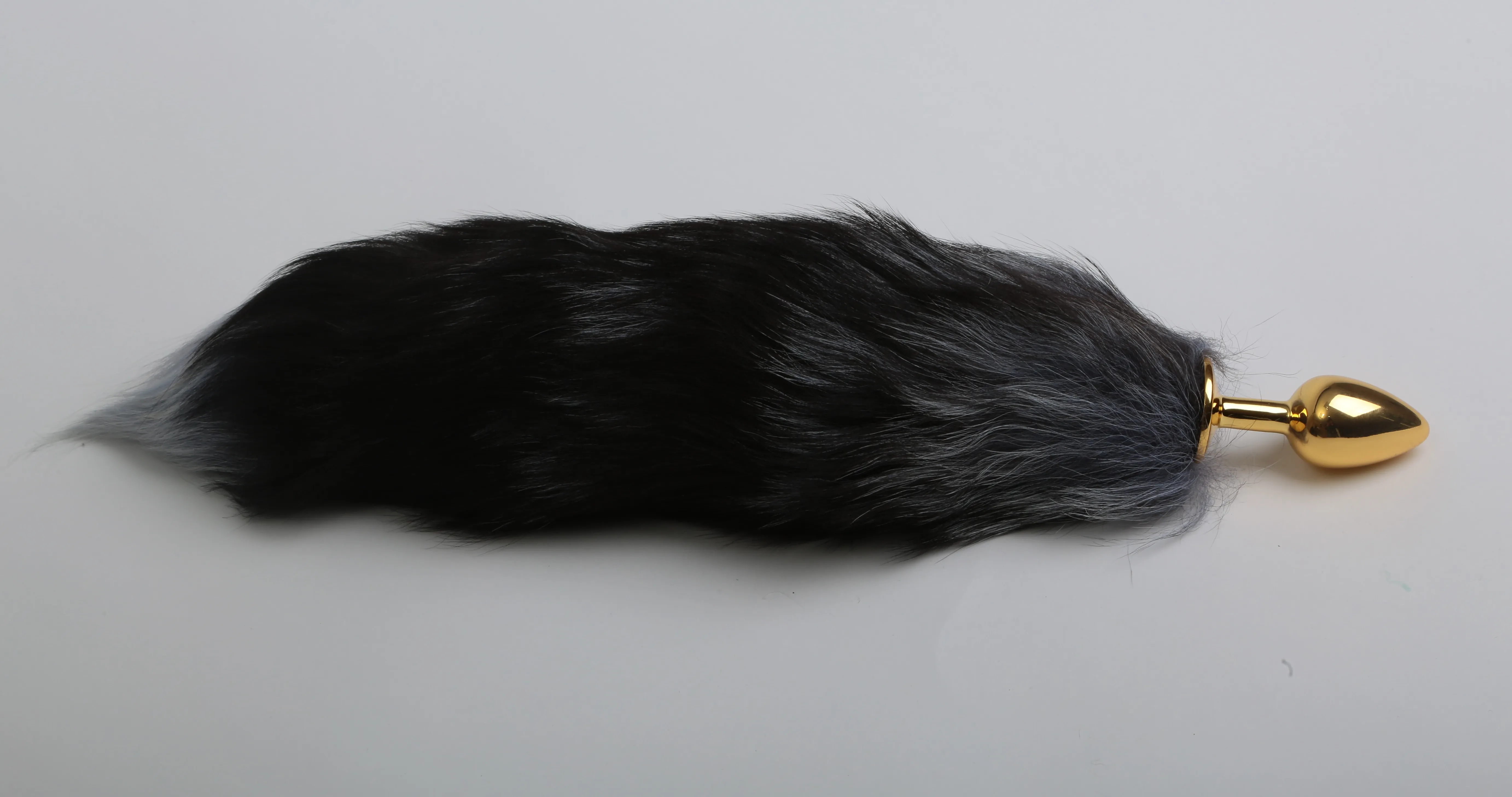 Золотистая анальная пробка с хвостиком. Характеристики: цвет пробки- золотистый, цвет хвоста- черный с серым, максимальный диаметр пробки - 2,5 см, общая длина пробки- 7 см, рабочая длина пробки -6,5 см, длинна хвоста- 40 см. Имеет ограничительное основание для безопасного использования. Упаковка: прозрачный пакет.