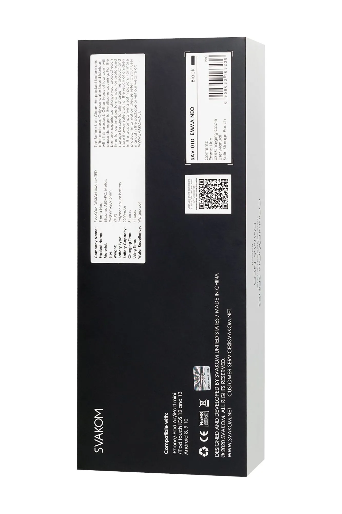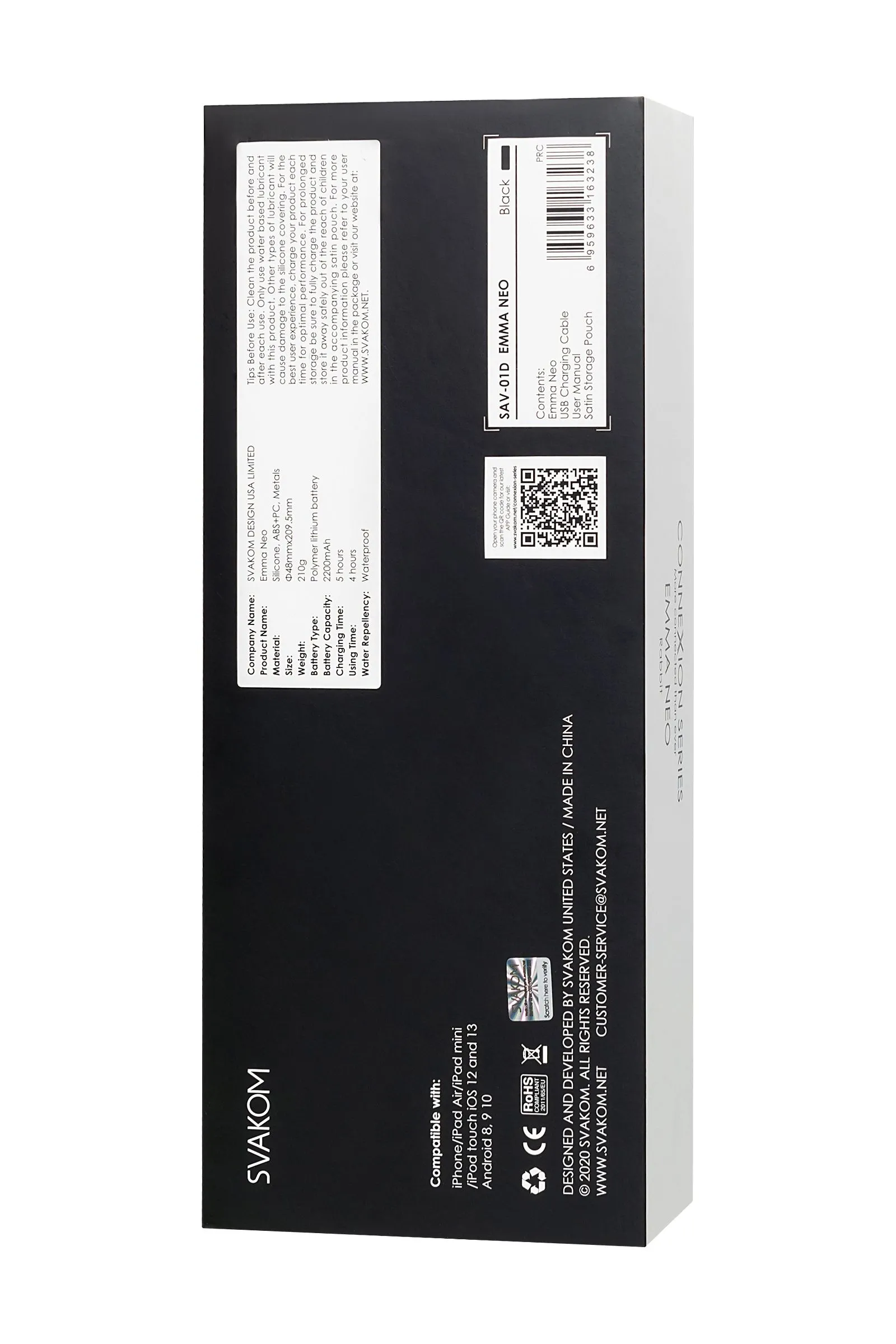 Svakom Emma Neo – это мощный, интерактивный, нагревающийся WAND-вибромассажер, с необычным дизайном. У игрушки гибкая головка и есть насадка в виде потрясающих кроличьих ушек. Используйте ее для массажа шеи, ушей, сосков и любых других чувствительных зон как самостоятельно, так и в паре. Будьте креативны и выведите любовную игру на новый уровень! Emma Neo поможет расслабиться после напряженного дня. Выберите подходящий режим и массируйте любые зоны, например шею и плечи. Emma Neo может нагреваться до 38°С, близкой к температуре человеческого тела. Воспользуйтесь этой функцией, чтобы согреться холодными вечерами. Мощный, но при этом тихий мотор, время работы без подзарядки до 4 часов, 5 скоростей вибрации, 5+1 режим – это все про Emma Neo! Игрушку легко мыть, погружая в воду только силиконовую часть. Emma Neo работает через Bluetooth, управляется с помощью приложений FeelConnect 3 и Svakom App на телефоне. Используйте его как хотите и с кем хотите! Если вы хотите использовать у игрушки классические режимы или синхронизировать вибрацию с музыкальными треками – функциями можно управлять через Svakom App. Если интересна тема теледильдоники, хочется попробовать игрушку с управлением на расстоянии, попробовать синхронизировать вибрацию с любимым порно-роликом, то тогда управлять можно через Feel Connect 3. Svakom Emma Neo - это воплощение заботы, элегантности, моды и интеллекта. Материал: безопасный для тела силикон + ABS Режимы вибрации: 6 Интенсивность: 5 Размер: 4,8 см × 21 см Вес: 210 г Цвет: черный Режим нагревания: да Заряжается: USB Время зарядки: 2 часа Используемое время: 48 часов Водонепроницаемость: IPX4 защита от брызг Интерфейс: Bluetooth В комплекте: Вибратор Emma Neo, насадка-ушки, мешочек для хранения, зарядный кабель USB, гарантийный талон, руководство. Страна бренда: США