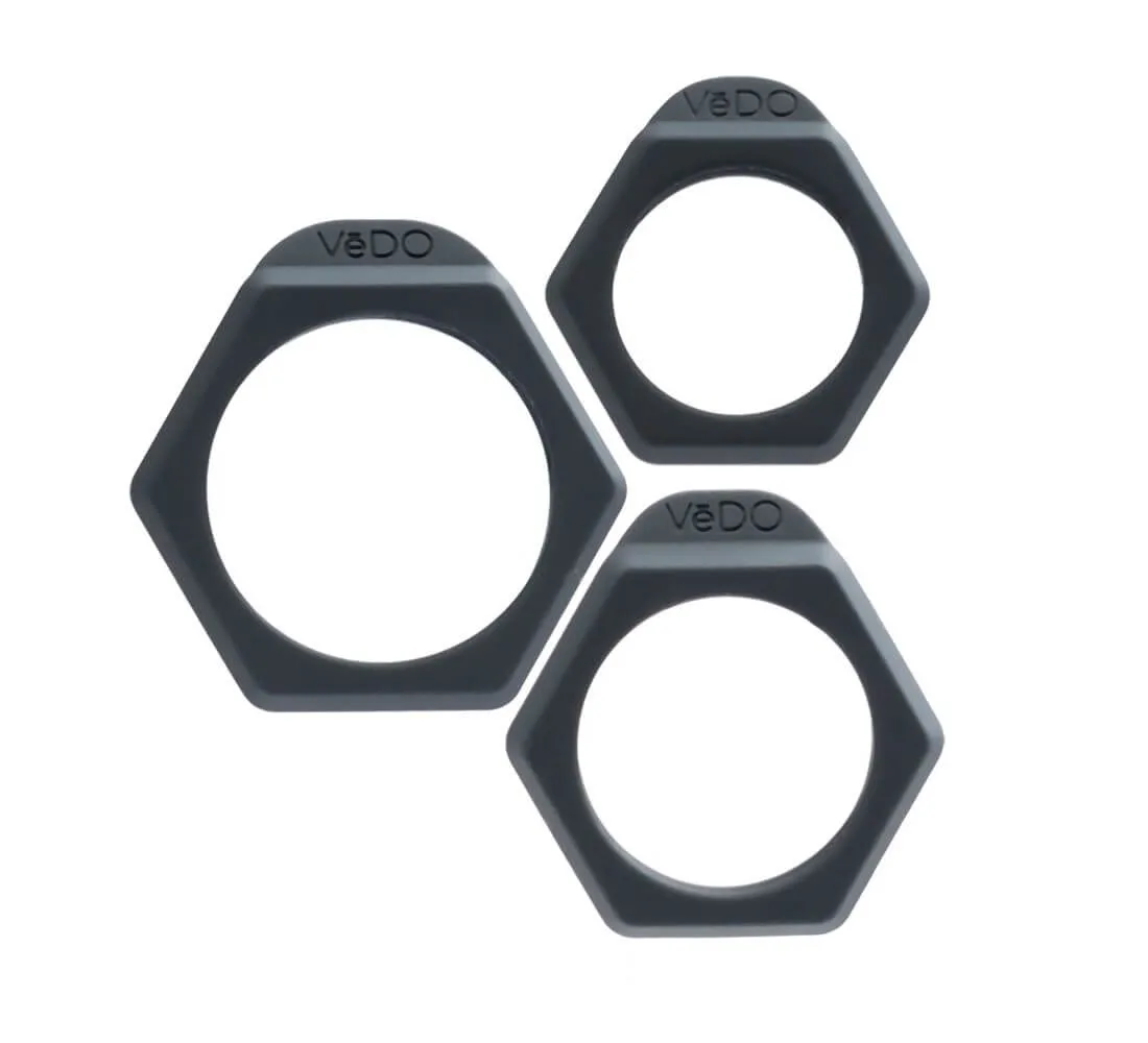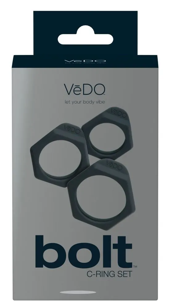 Набор колец VeDO Bolt от немецкой компании Orion состоит из трех эрекционных колец разного диаметра с угловатым дизайном. Несколько размеров позволят подобрать нужное кольцо для наибольшего удобства и удовольствия. Их можно использовать и в нескольких вариантах комбинаций, например носить их одновременно на члене и на мошонке для усиления ощущений.