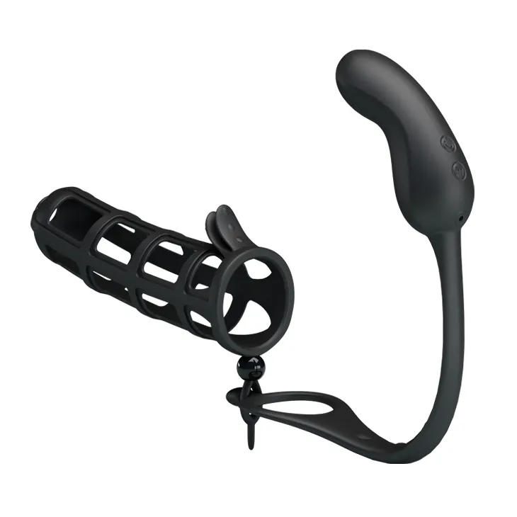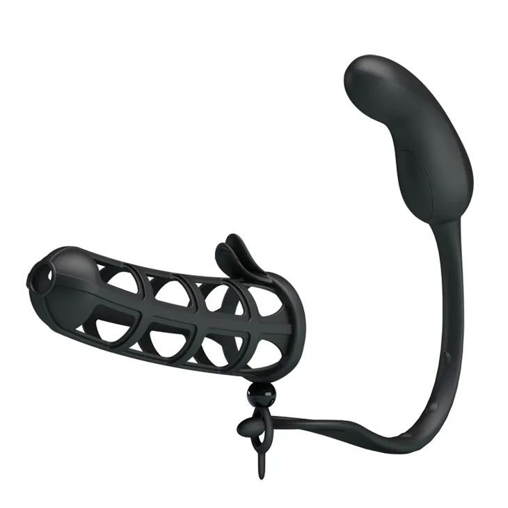 Насадка на пенис черного цвета с мягкими клиторальными язычками для большего удовольствия партнерши. Изготовлена из 100% силикона. Приятная на ощупь, легко растягивается до нужного размера (длина насадки- 11,5 см, диаметр отверстия- 4 см). Дополнена анальным стимулятором с 7-ю режимами вибрации (рабочая длина- 8 см, максимальный диаметр- 3 см). Вес игрушки: 62 гр. Упаковка: картонная коробка с принтом.
