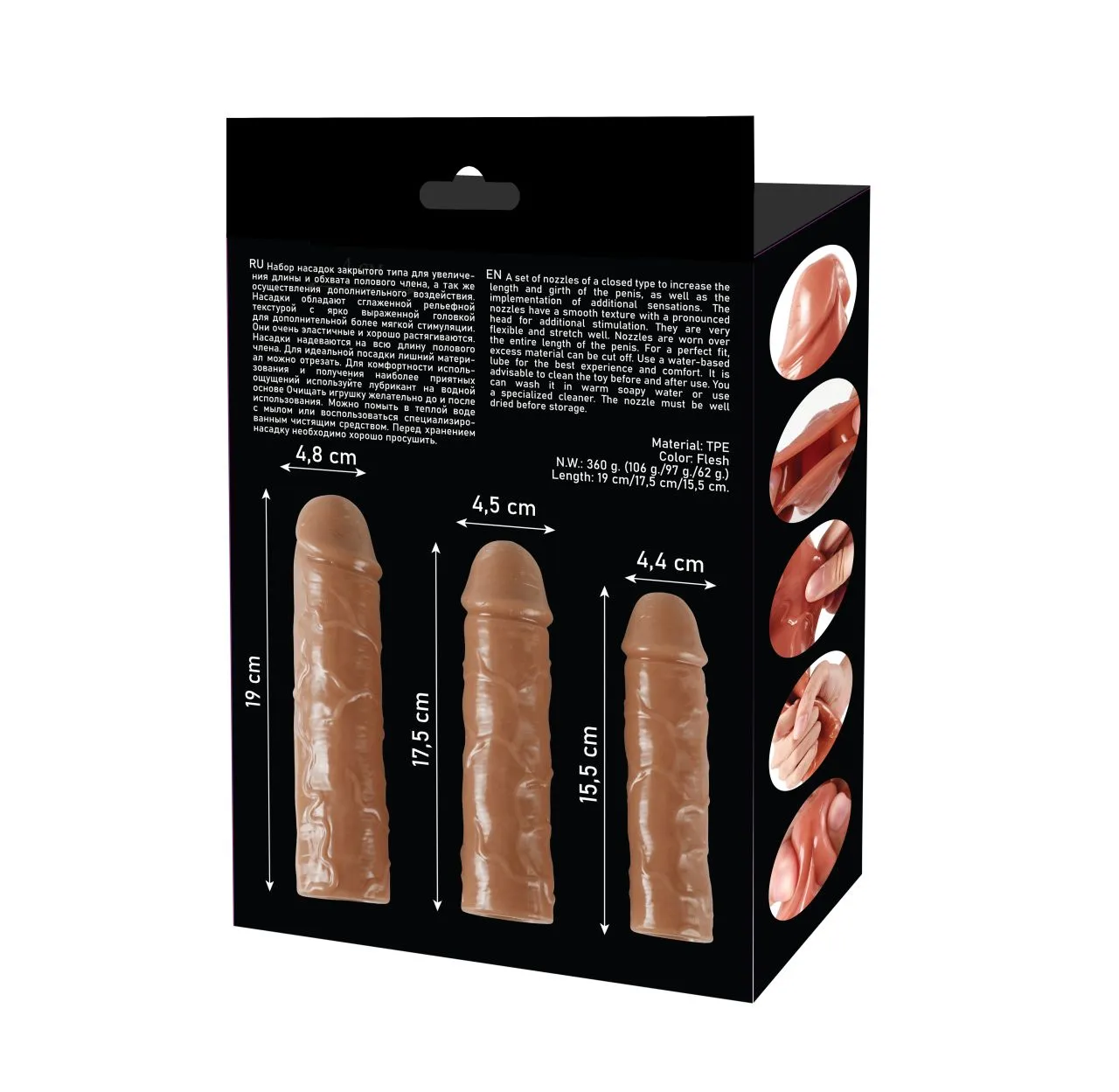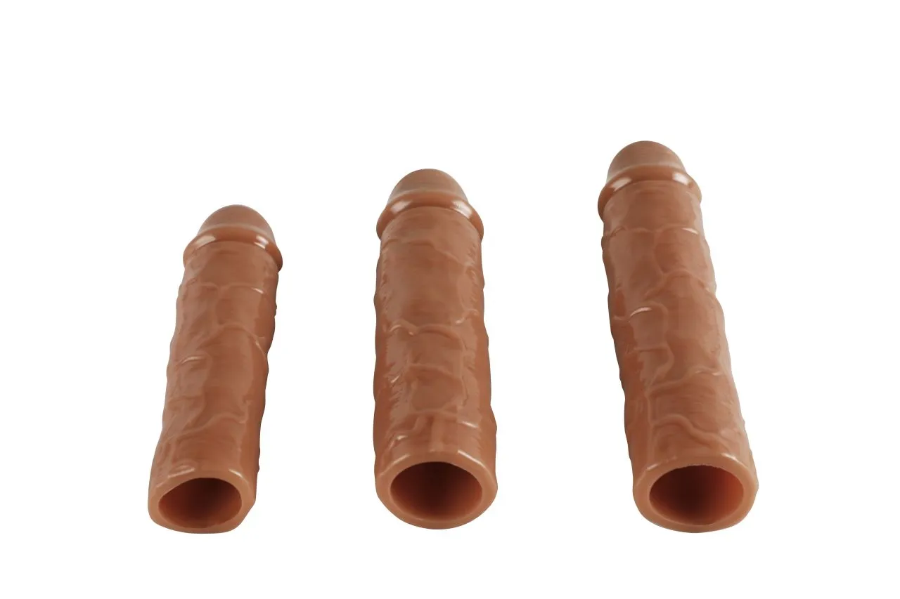 Набор насадок закрытого типа для увеличения длины и обхвата полового члена, а так же осуществления дополнительного воздействия. Насадки обладают сглаженной рельефной текстурой с ярко выраженной головкой для дополнительной более мягкой стимуляции. Они очень эластичные и хорошо растягиваются.