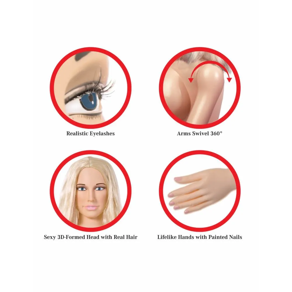 Надувная кукла Hannah Harper - это блондинка с голубыми глазами, объемными ресницами и сексуально приоткрытыми губами. Рост куклы составляет 150 сантиметров. Вагина и анус изготовлены из имитирующего кожу материала термопластичной резины. Вставка вагина и анус легко снимается и может использоваться как самостоятельный мастурбатор. Для того чтобы игрушка прослужила Вам как можно дольше, следует очищать ее после каждого использования. Для этого подойдут мягкие моющие средства и теплая вода. После водных процедур куклу рекомендуется протереть мягкой тряпочкой, хорошенько просушить, сдуть, аккуратно сложить. Хранить в прохладном сухом месте, вдали от прямых солнечных лучей. Поставляется в комплекте с насосом и виниловым набором для ремонта.