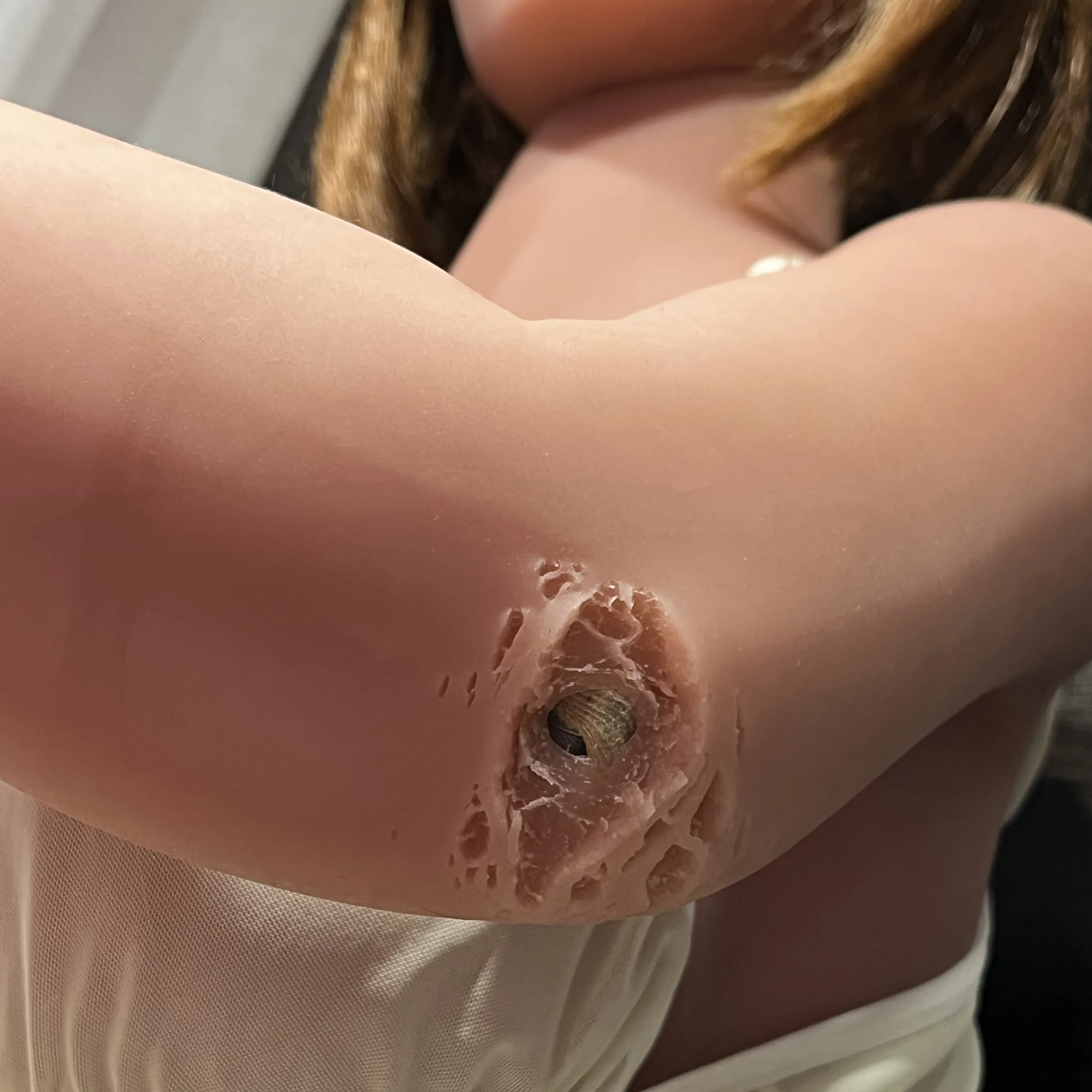 Кукла сделана из термопластичного эластомера телесного цвета, который отличается необычайной мягкостью и бархатистостью. Этот гипоаллергенный материал очень гибкий и быстро принимает температуру тела. У куклы сгибаются пальцы и колени, поэтому ей можно будет придать нужную позу. Ее упругая грудь со светло-коричневыми сосками просто создана для страстных ласк и нежных поглаживаний, которых возбудят Вас до предела. У нее есть три любовных отверстия для вагинального, анального и орального секса. Вагина съемная и при необходимости ее можно извлечь и тщательно промыть.