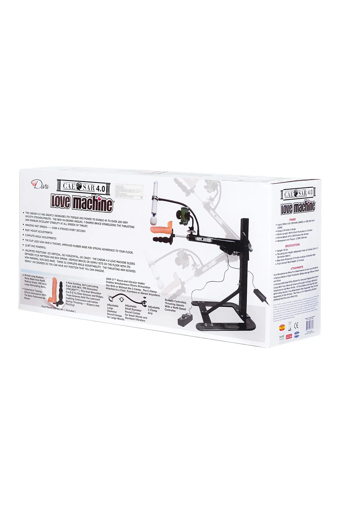 Секс-машина Цезарь 4.0 - четвертое поколение знаменитой секс-машины! Еще мощнее! Еще тише! Еще устойчивее! Новинка 2015 года, секс-машина Цезарь 4.0 Love Machine легко собирается в течение нескольких минут. Новый бесшумный мотор подарит бесконечное удовольствие от мощных фрикций доводя Вас до оргазма снова и снова!.. Скорость сексмашины удобно регулируется до 260 фрикций в минуту. Есть выносной пульт с длинным шнуром. Благодаря своей конструкции секс-машина Цезарь 4.0 может быть использована в большом диапазоне позиций, разворот штока возможен почти на 180 градусов - до вертикального в потолок. Есть фиксатор для предотвращения самопроизвольного изменения угла наклона. Шток можно перемещать по вертикальной штанге и поднимать на высоту от 15 до 56 см от пола. Возможно использование сменных фаллоимитаторов системы Vac-U-Lock. Возможно использование двойного и универсального адаптеров для фаллоимитаторов, а также Fleshlight-адаптера для мягких и нежных мастурбаторов линейки Fleshlight. Машина любви Цезарь 4.0 имеет плоское основание с декоративными резиновыми вставками, которые не позволяют ей скользить по гладкой поверхности или смещаться во время работы, что придает дополнительную устойчивость. В разобранном состоянии сексмашина помещается под кроватью, в шкафу или даже в диване. Секс-машина Цезарь 4.0 идеально подходит для анального и вагинального секса, может быть использована как дома так и на секс-вечеринке с друзьями, в клубе. Откройте новые грани удовольствия вместе с секс-машиной Цезарь 4.0!