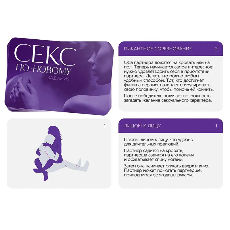 Что нужно делать? Разделите карты на две колоды: «позы» и «задания». «Задания» Вытягивайте карточки из этой колоды, зачитывайте их содержание и воплощайте его в жизнь. «Позы» Вытягивайте карточку из этой колоды, смотрите на изображение, читайте описание и воплощайте данную позу в жизнь. Вы можете остановиться только на одной колоде или сначала попробовать одну, а потом другую. А если есть желание поэкспериментировать, комбинируйте карточки между собой.